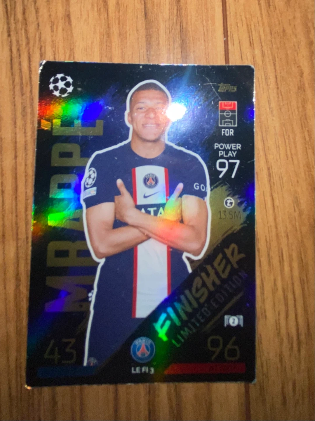 This is a Topps football card featuring Kylian Mbappé. It's a limited edition 'Finisher' card with a power play rating of 97. The card has player stats of 43 and 96.