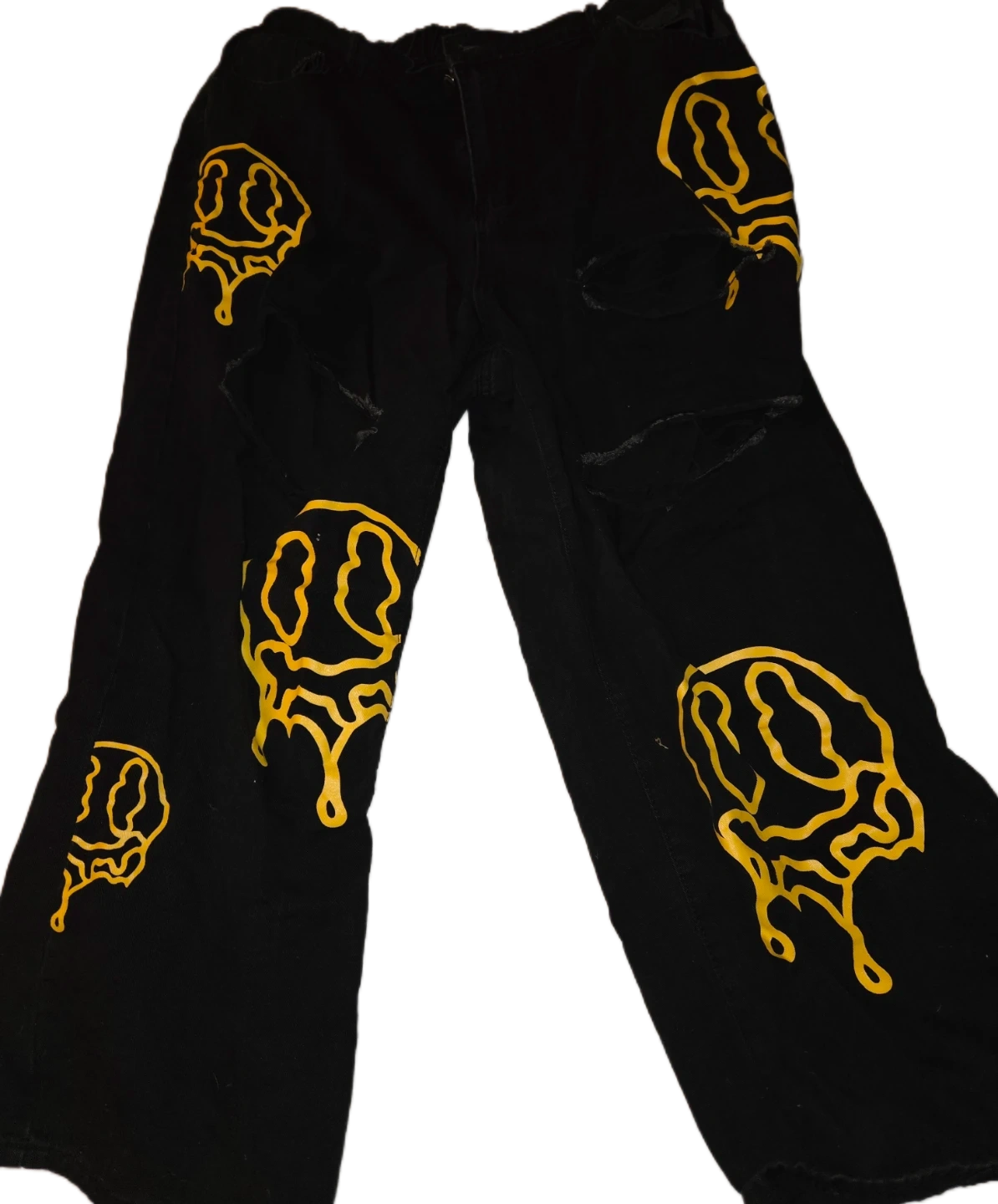 Black pants featuring a yellow, melting smiley face graphic print. These pants have a distressed, ripped look. They're made from a durable denim-like material.