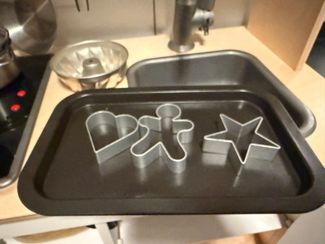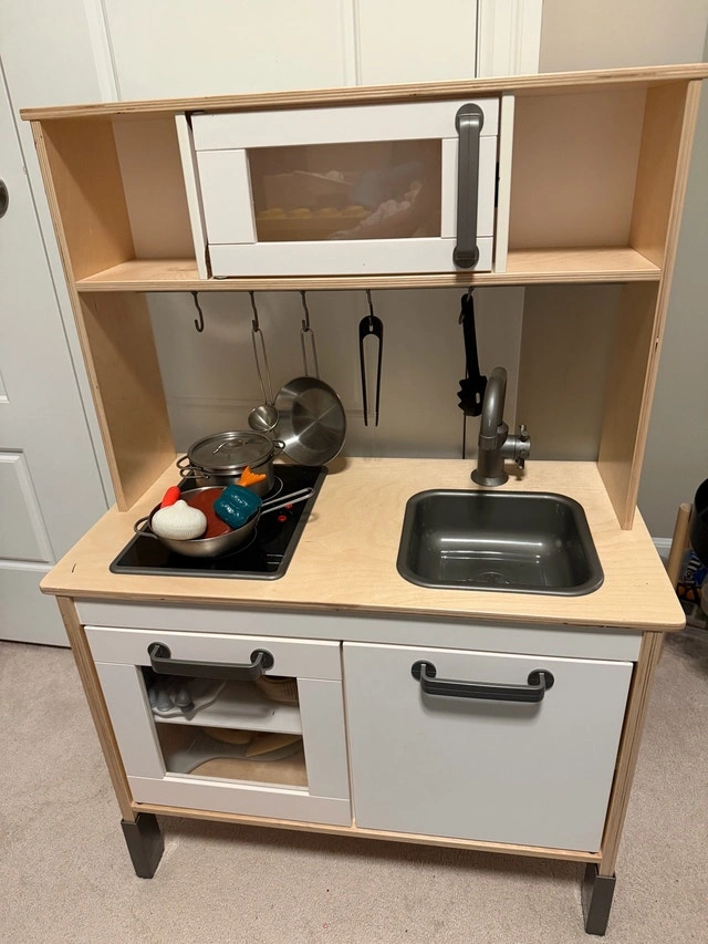 This is a used Ikea Duktig play kitchen. It features a sink, stove, microwave, and storage space. It also comes with pots, pans, and play food. It's in good condition with minor damage. I'm selling it because my child has outgrown it. If the ad is up, it's still available!