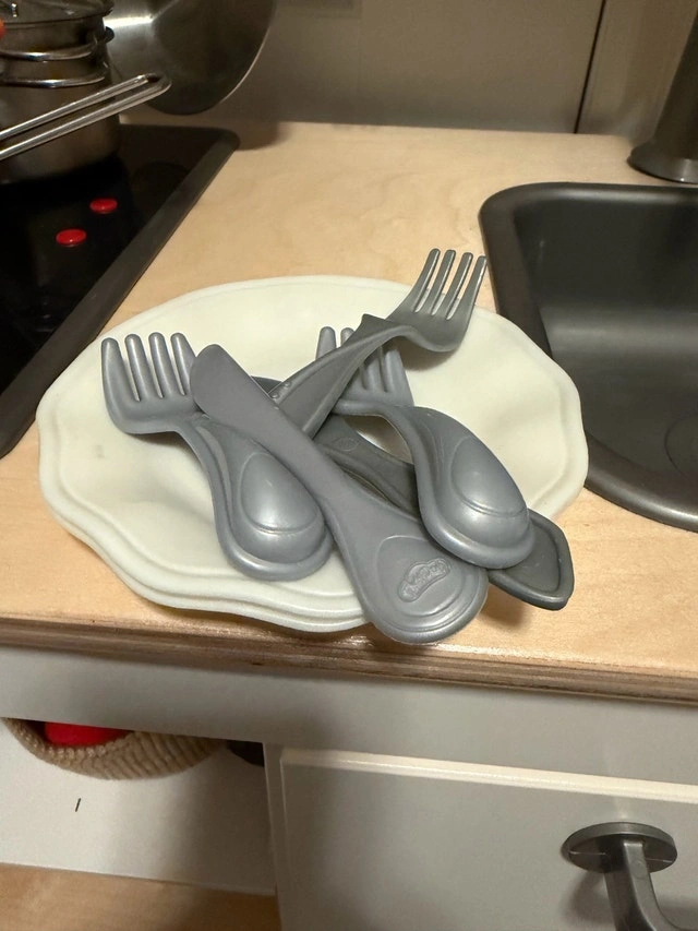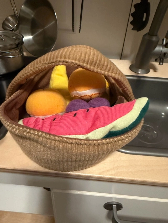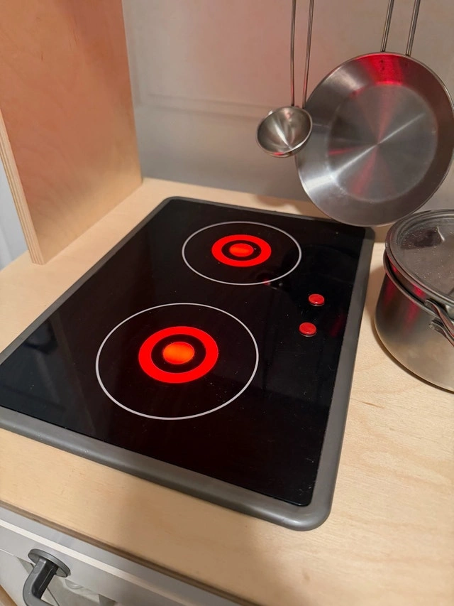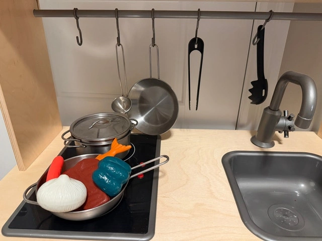 This is a used Ikea Duktig play kitchen. It features a sink, stove, microwave, and storage space. It also comes with pots, pans, and play food. It's in good condition with minor damage. I'm selling it because my child has outgrown it. If the ad is up, it's still available!
