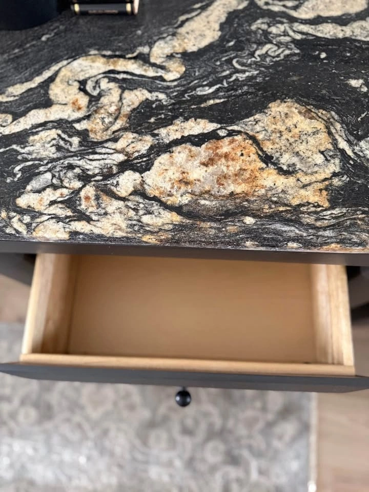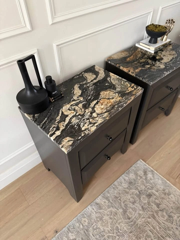 Completely refinished pair of nightstands, painted in Black Beauty by Benjamin Moore and sealed multiple times for durability. Finished with custom Brazilian granite tops that add a rich, high end look. Pick up Mississauga. 23.75”L 27”H 16”D IG recycled_restored