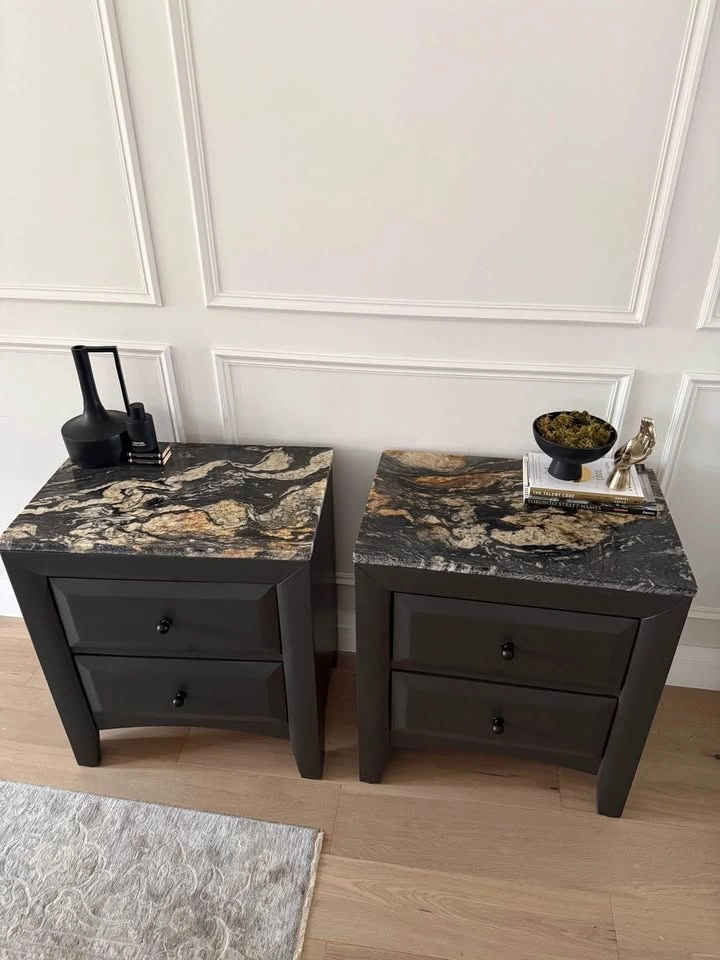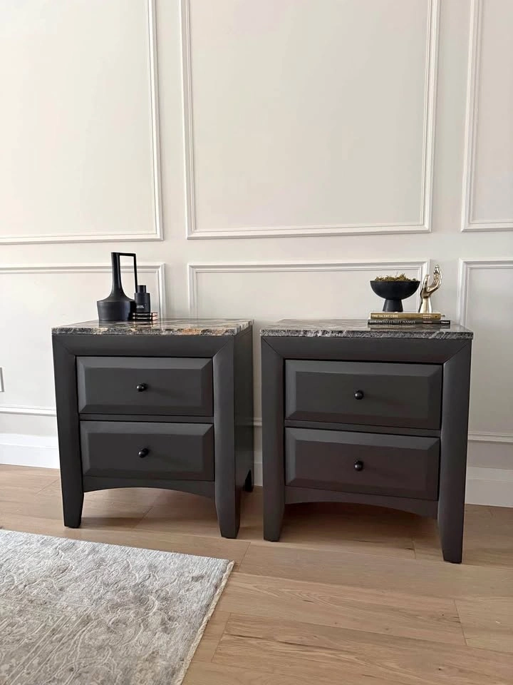 Completely refinished pair of nightstands, painted in Black Beauty by Benjamin Moore and sealed multiple times for durability. Finished with custom Brazilian granite tops that add a rich, high end look. Pick up Mississauga. 23.75”L 27”H 16”D IG recycled_restored