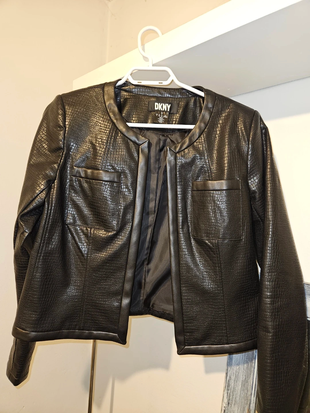 This DKNY cropped jacket features a black faux leather material with an embossed texture. It has a smooth lining and two front flap pockets.