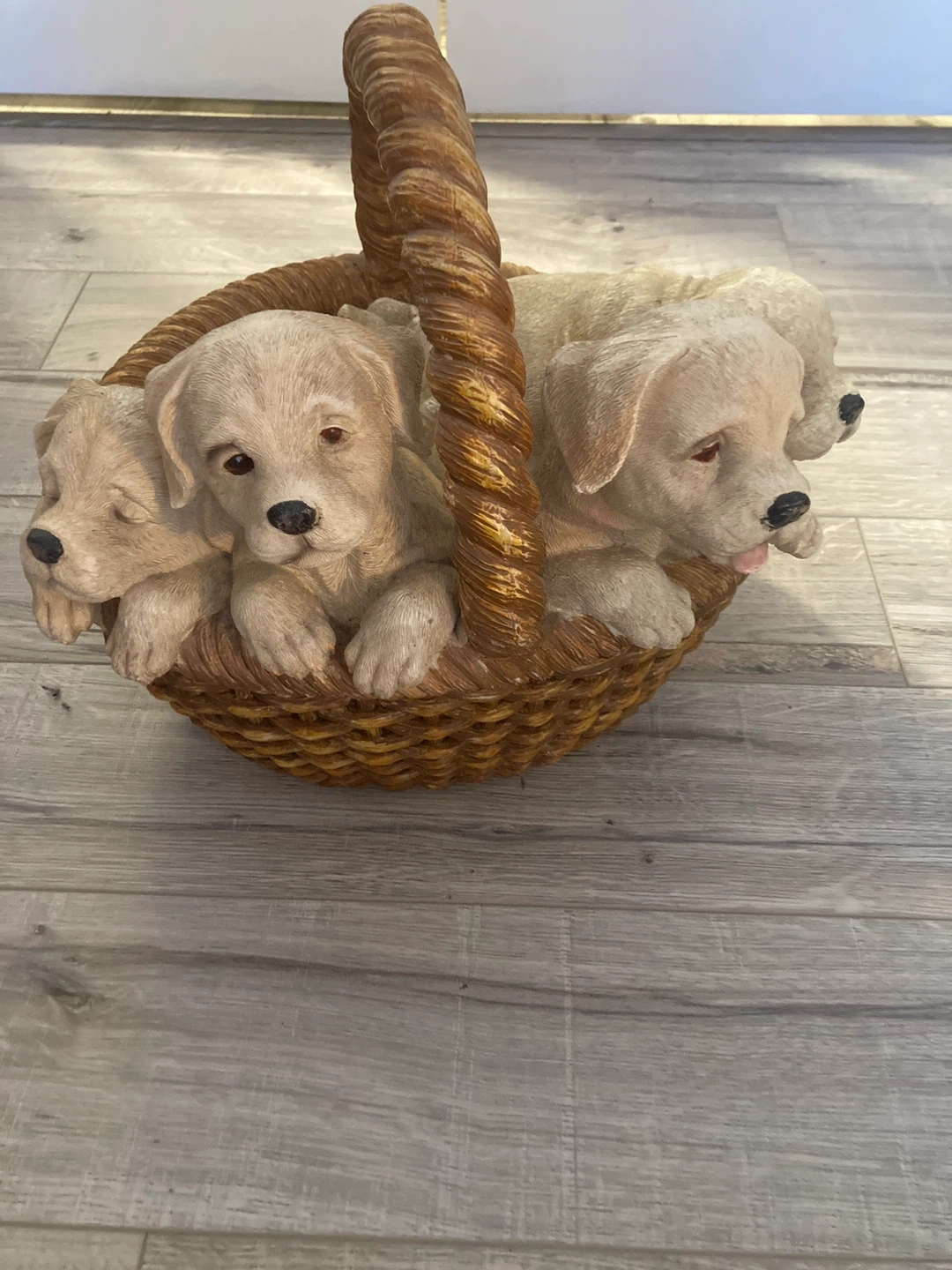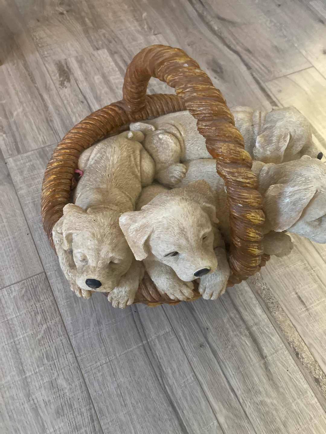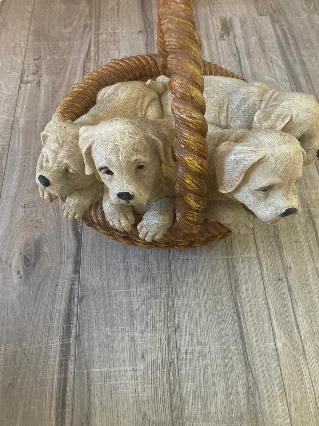 This is a cute figurine featuring four puppies nestled in a basket. It's made of a durable resin material. This piece adds a charming touch to any home decor.