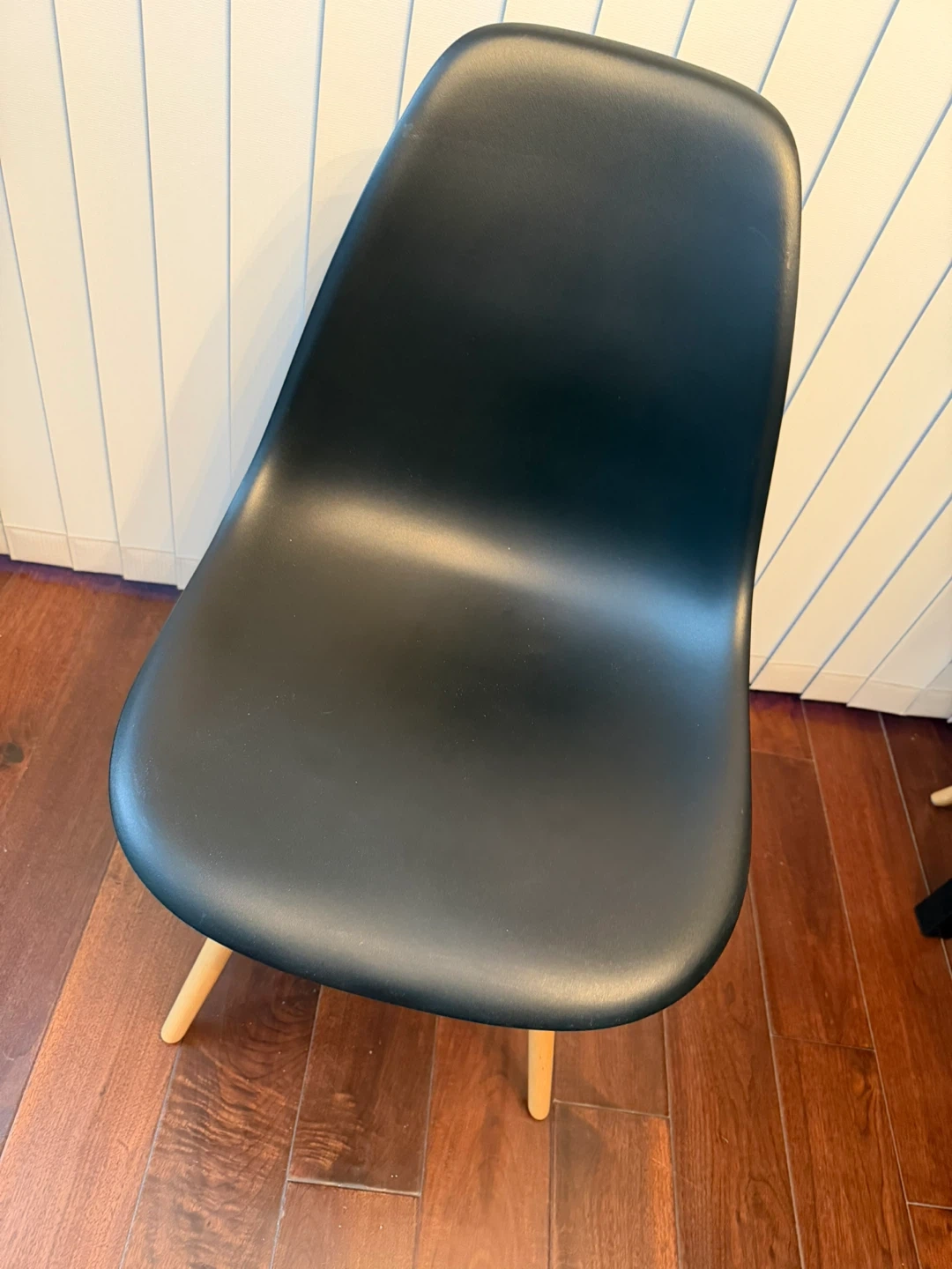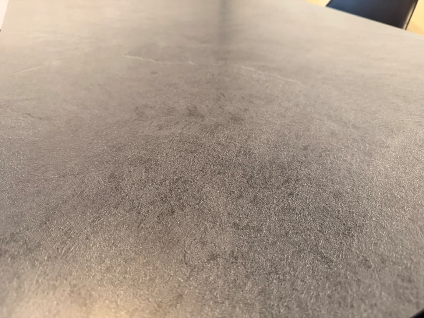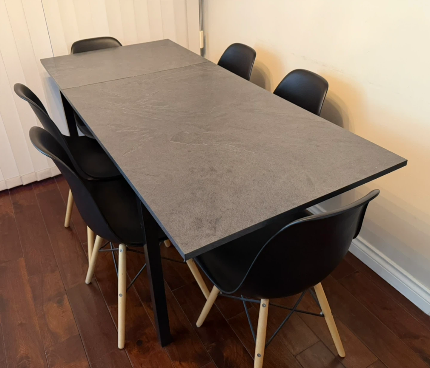This set includes a modern grey dining table with a stone-like finish. It's complemented by four black chairs with wooden legs. Great for smaller dining spaces!