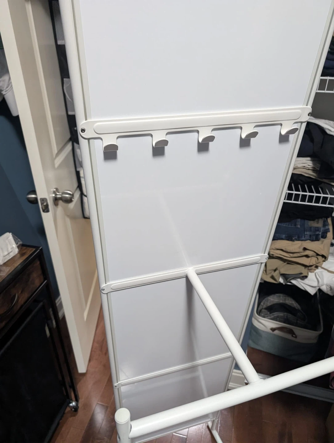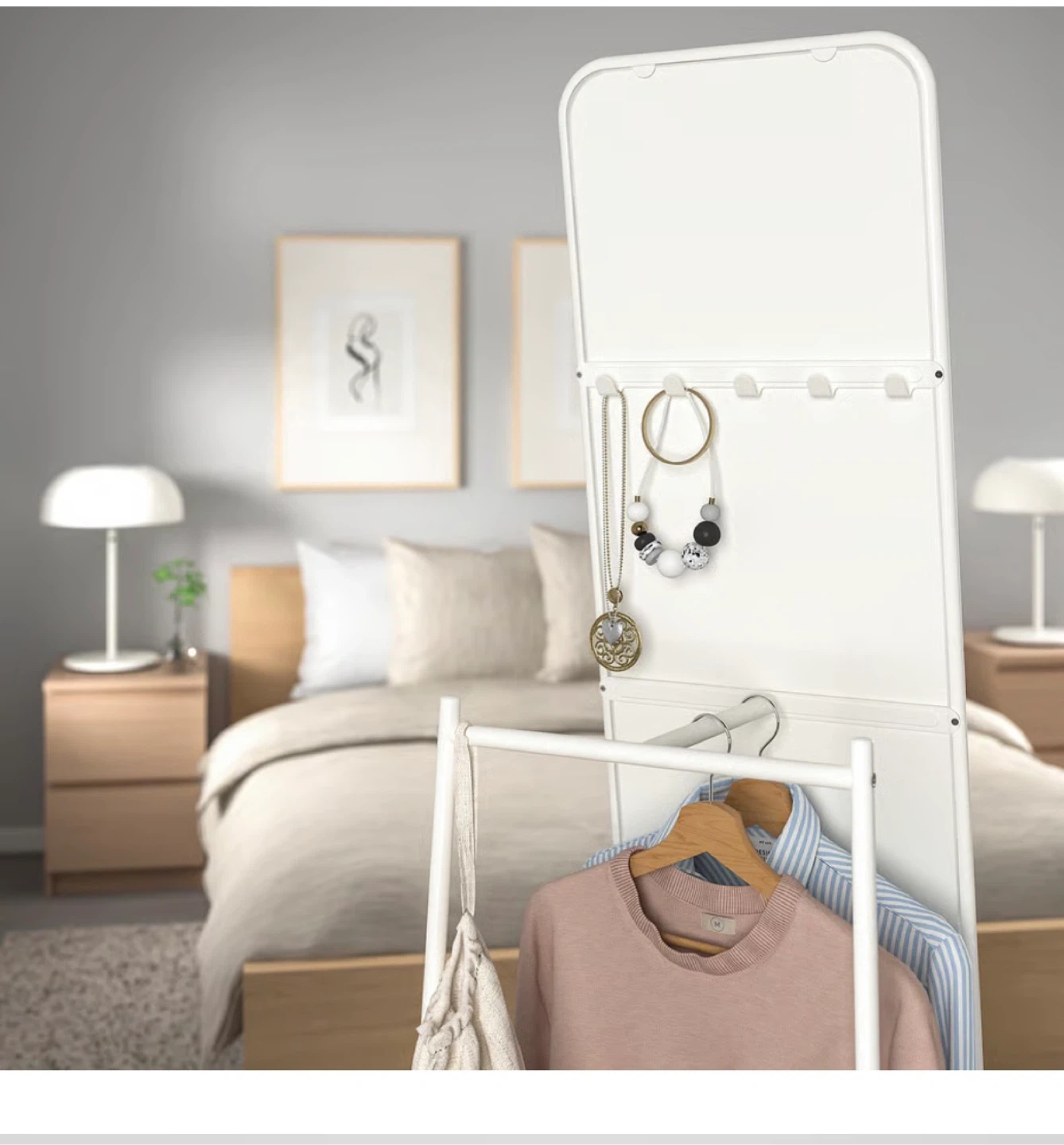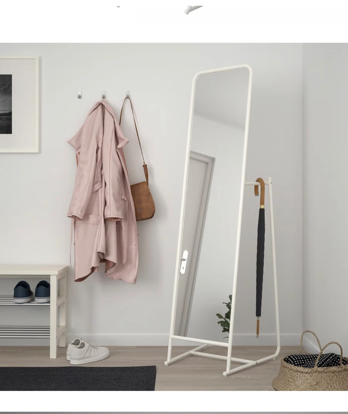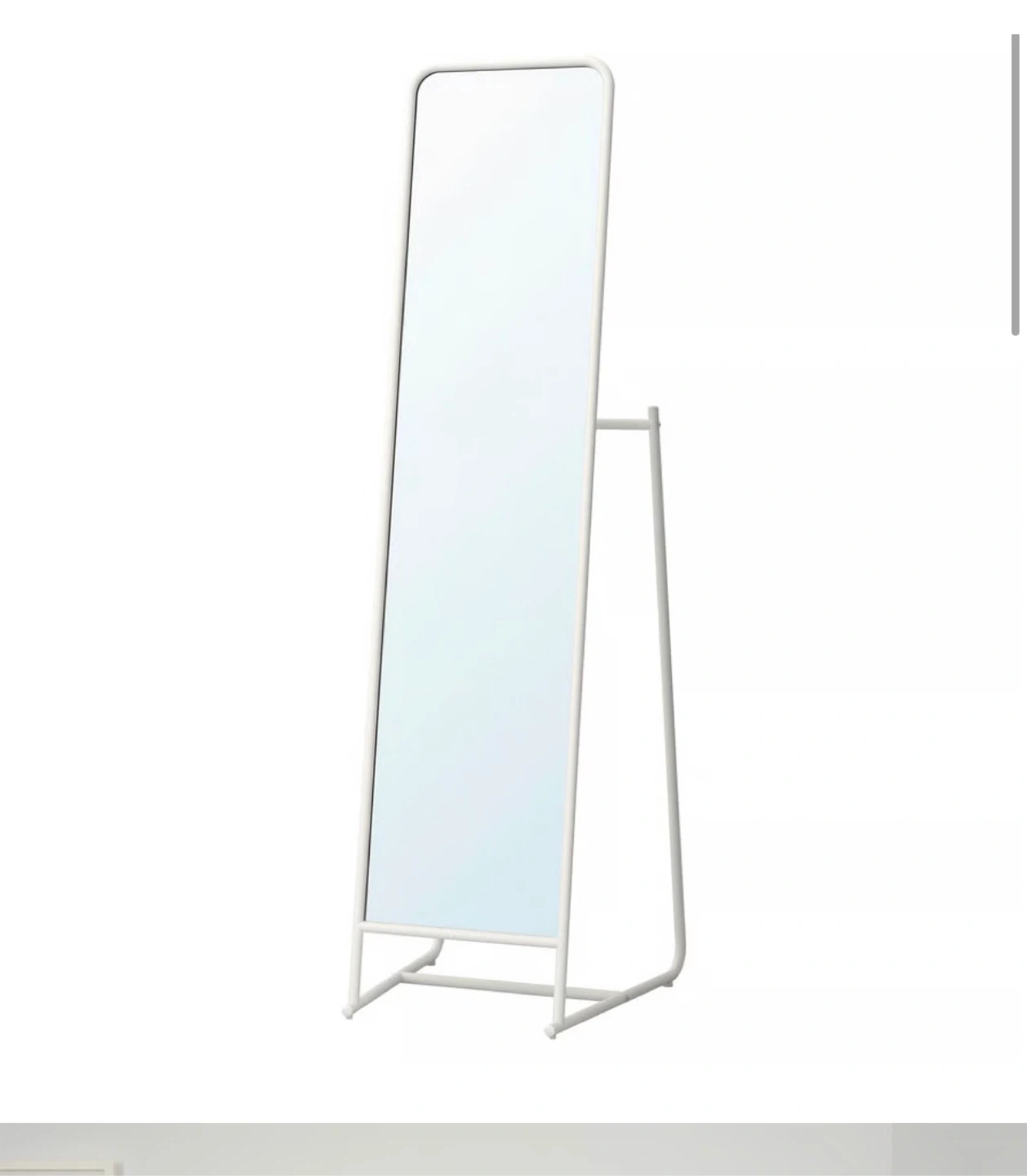 Selling an IKEA Knapper standing mirror in white. It's a great full-length mirror with a handy rack on the back for hanging clothes and accessories. Perfect for small spaces and keeping things organized!