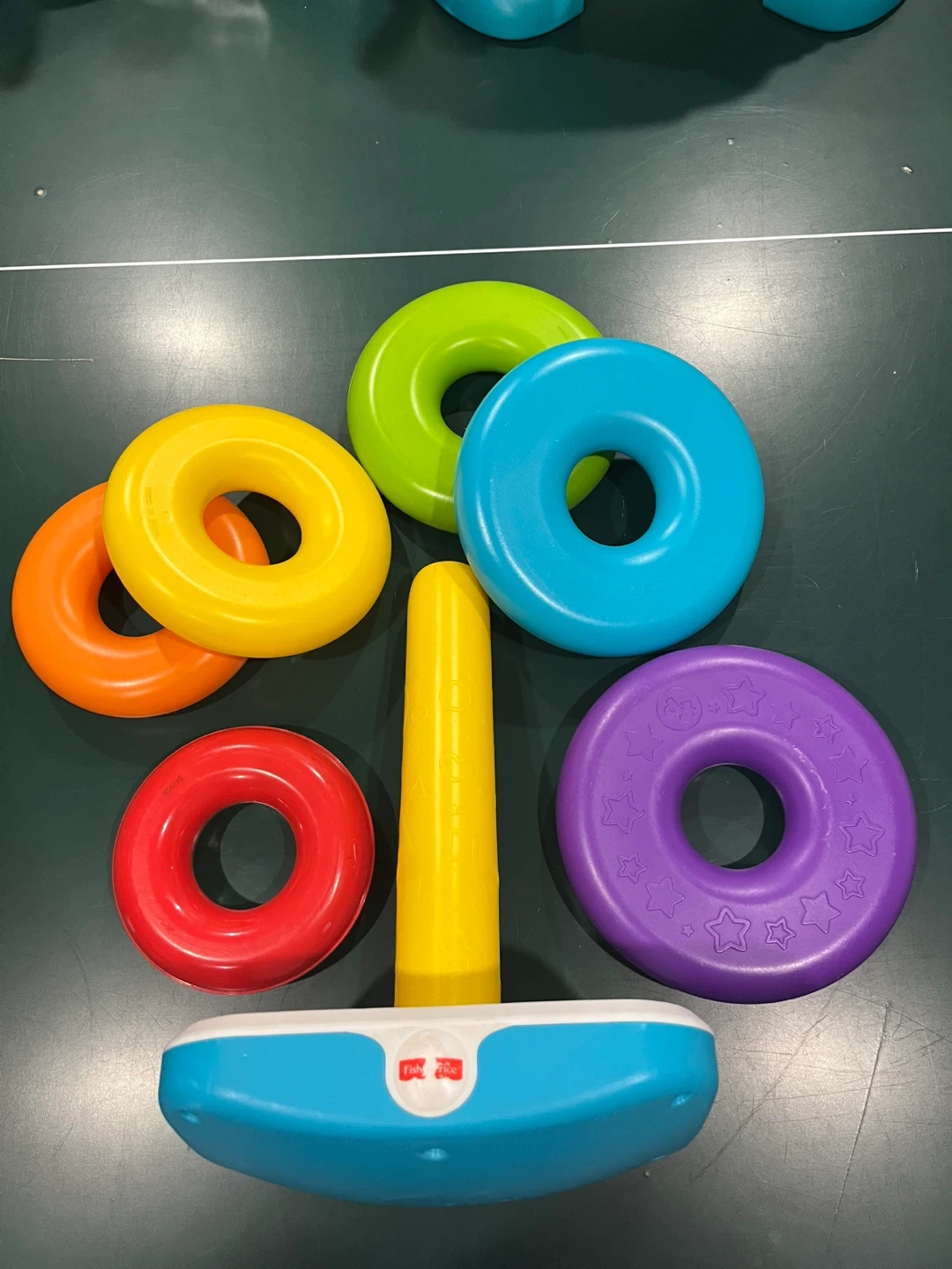 Fisher-Price Rock-a-Stack ring toy. It comes with a base, stacking pole, and six colourful rings. It's a classic toy for little ones to learn sorting and stacking!