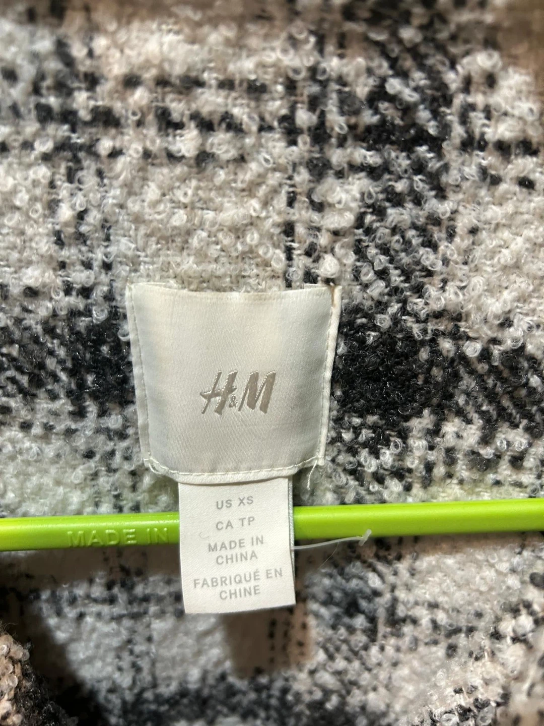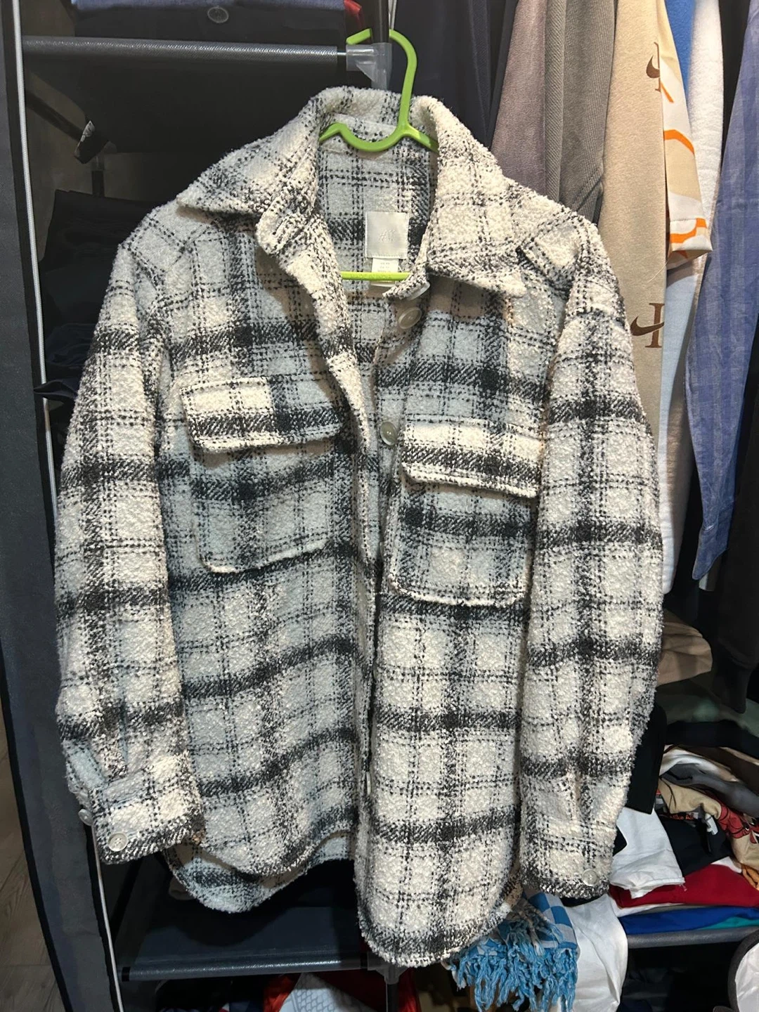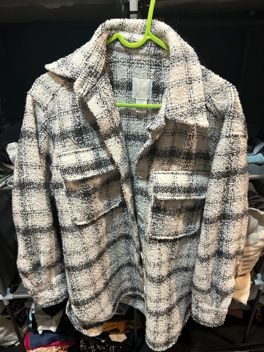 - Cozy thick H&M shacket in a black and white plaid pattern. Size is XS, but v oversized.