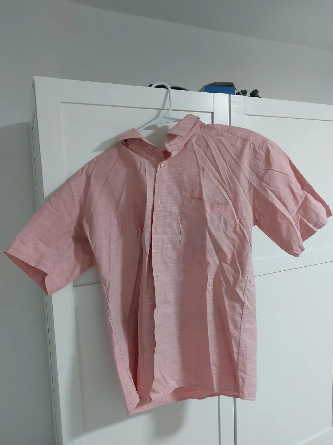 Men's short sleeve button-up shirt in a light pink colour. It has a subtle striped texture throughout. Features a chest pocket and a collared neckline. Easy to dress up or down!