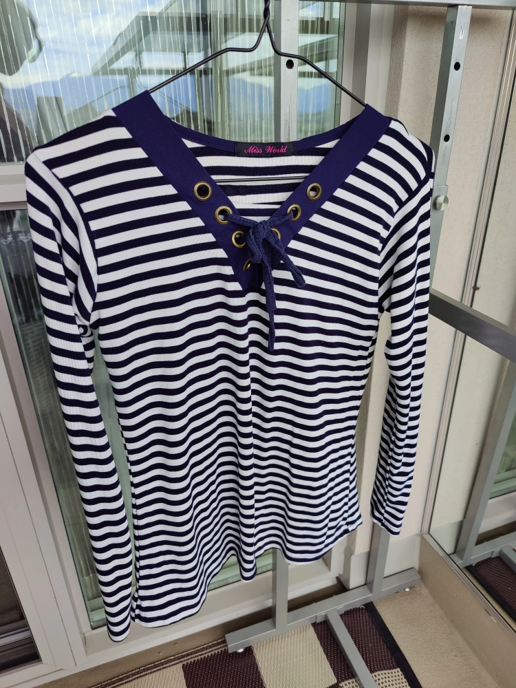 9️⃣ Navy & White Striped Lace-Up Top – $7