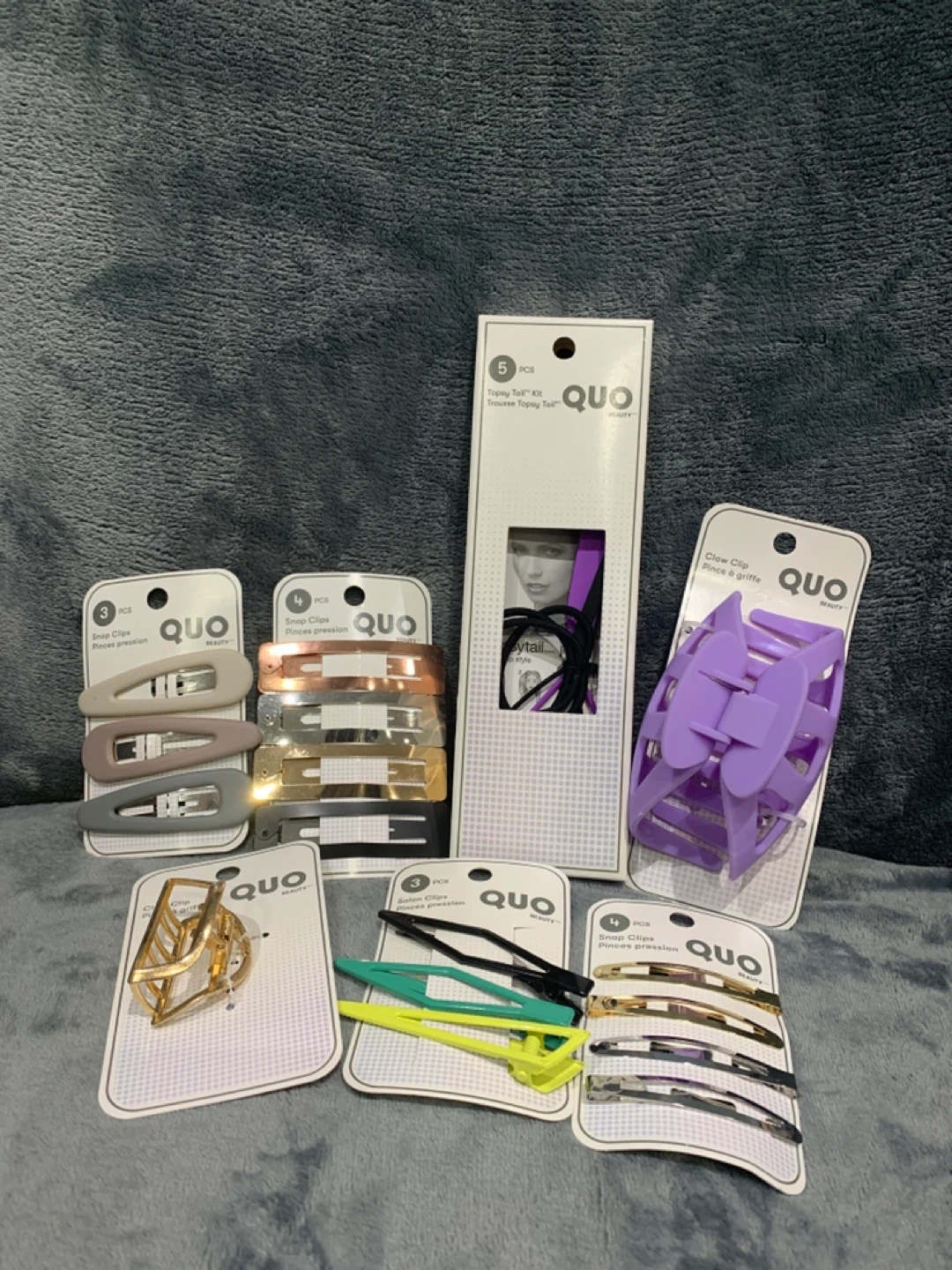 Assorted QUO Beauty hair accessories including snap clips, salon clips, a claw clip, and a Topsy Tail kit. Various colours and quantities are included.
