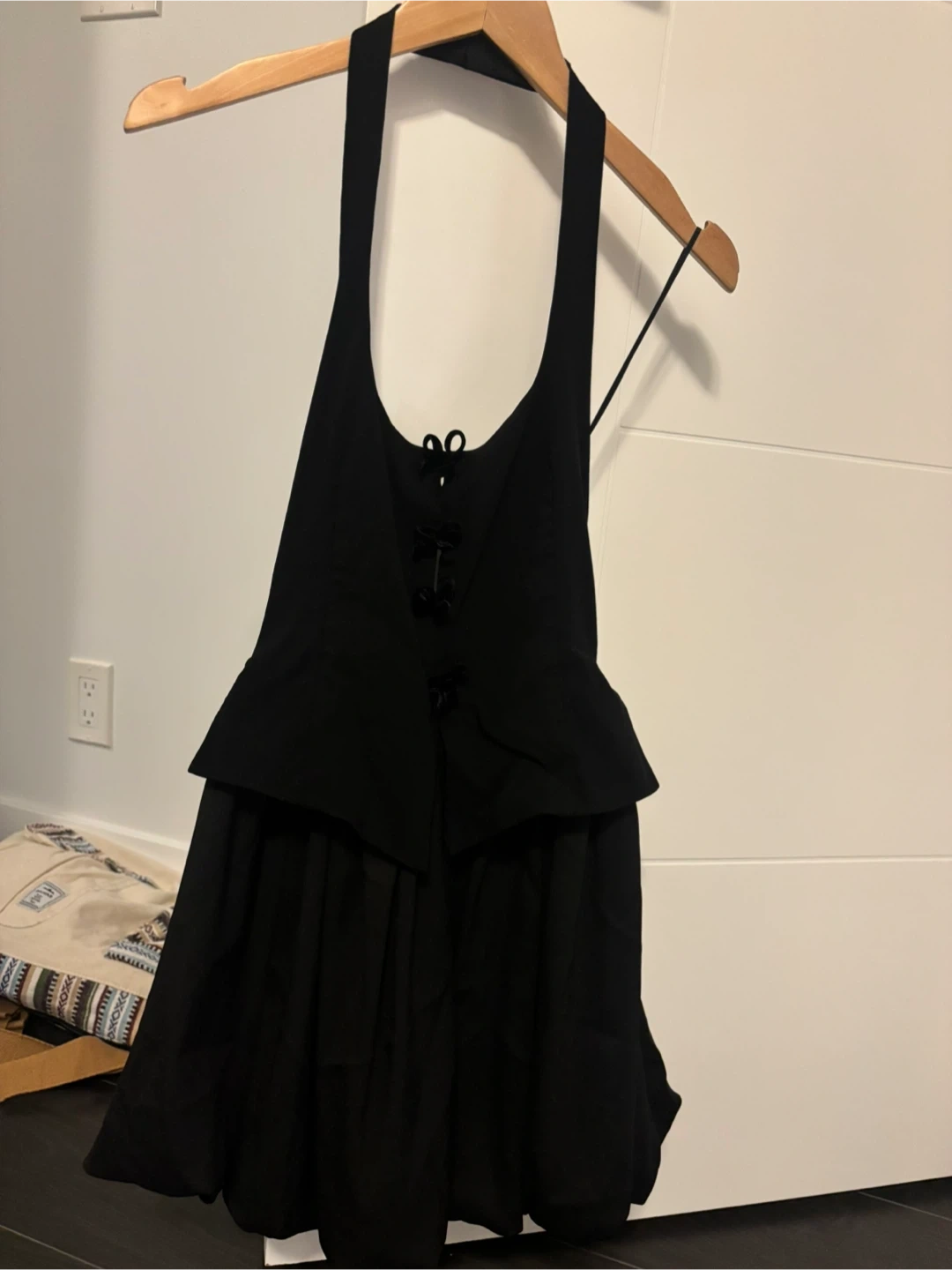 This is a black halter neck mini dress from Zara. It's a size small and features a gathered skirt and decorative buttons on the bodice. Perfect for a night out!