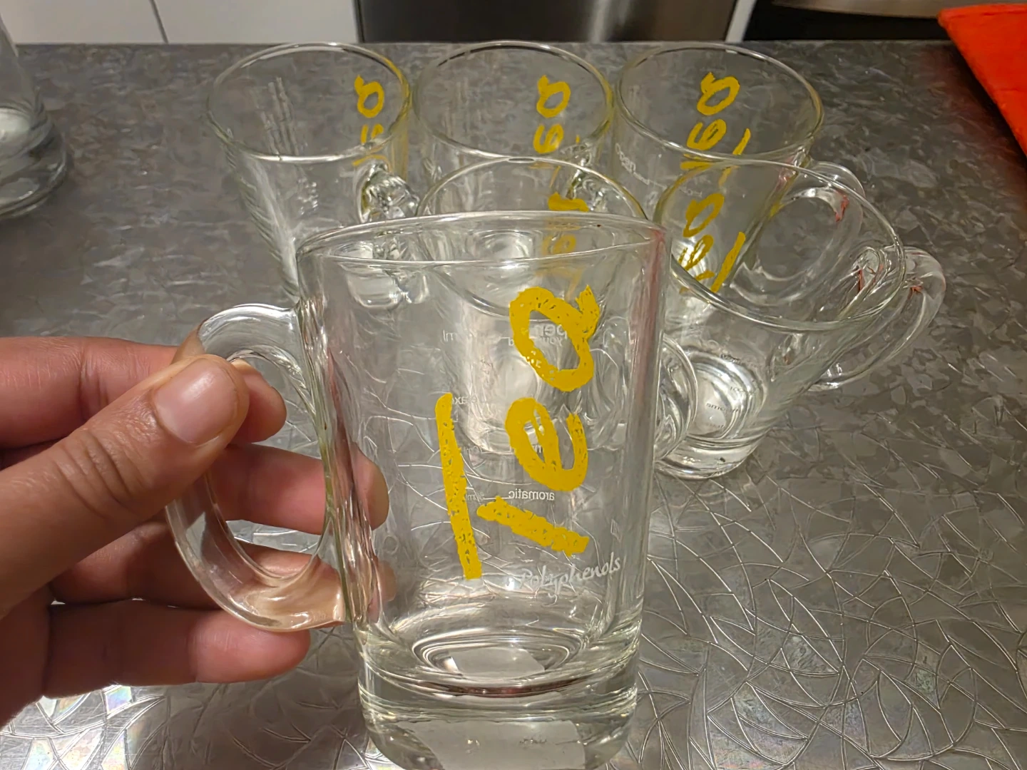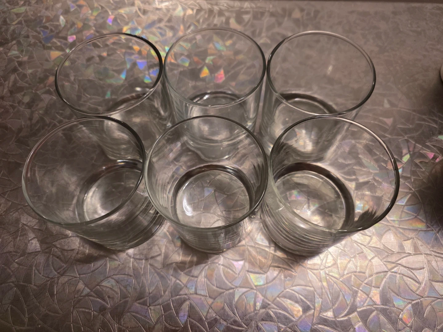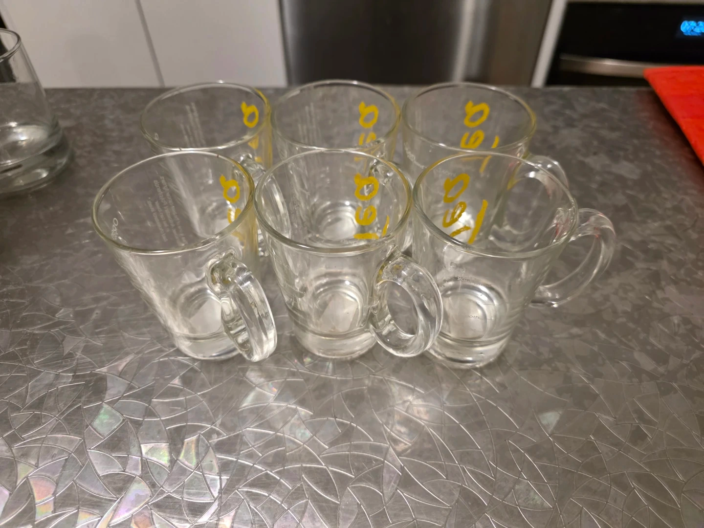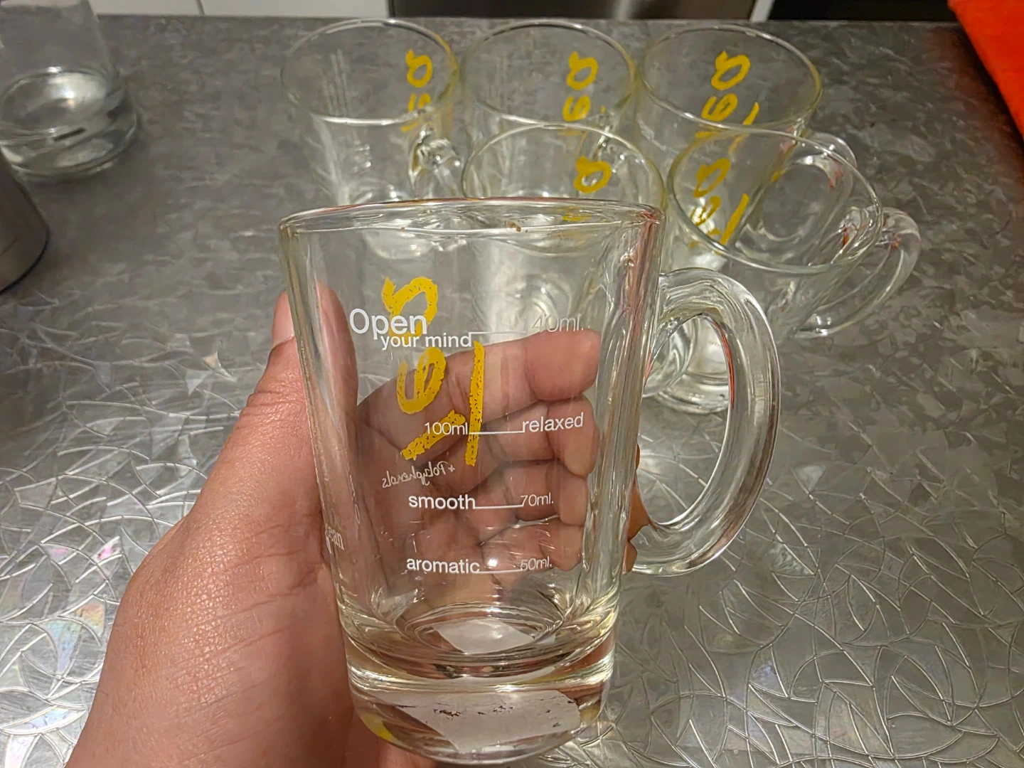 This is a set of six glass mugs with handles. Each mug has "Open your mind" printed on it along with measurements for 50ml, 70ml, 100ml, and 120ml. They're perfect for serving small beverages or as unique shot glasses!