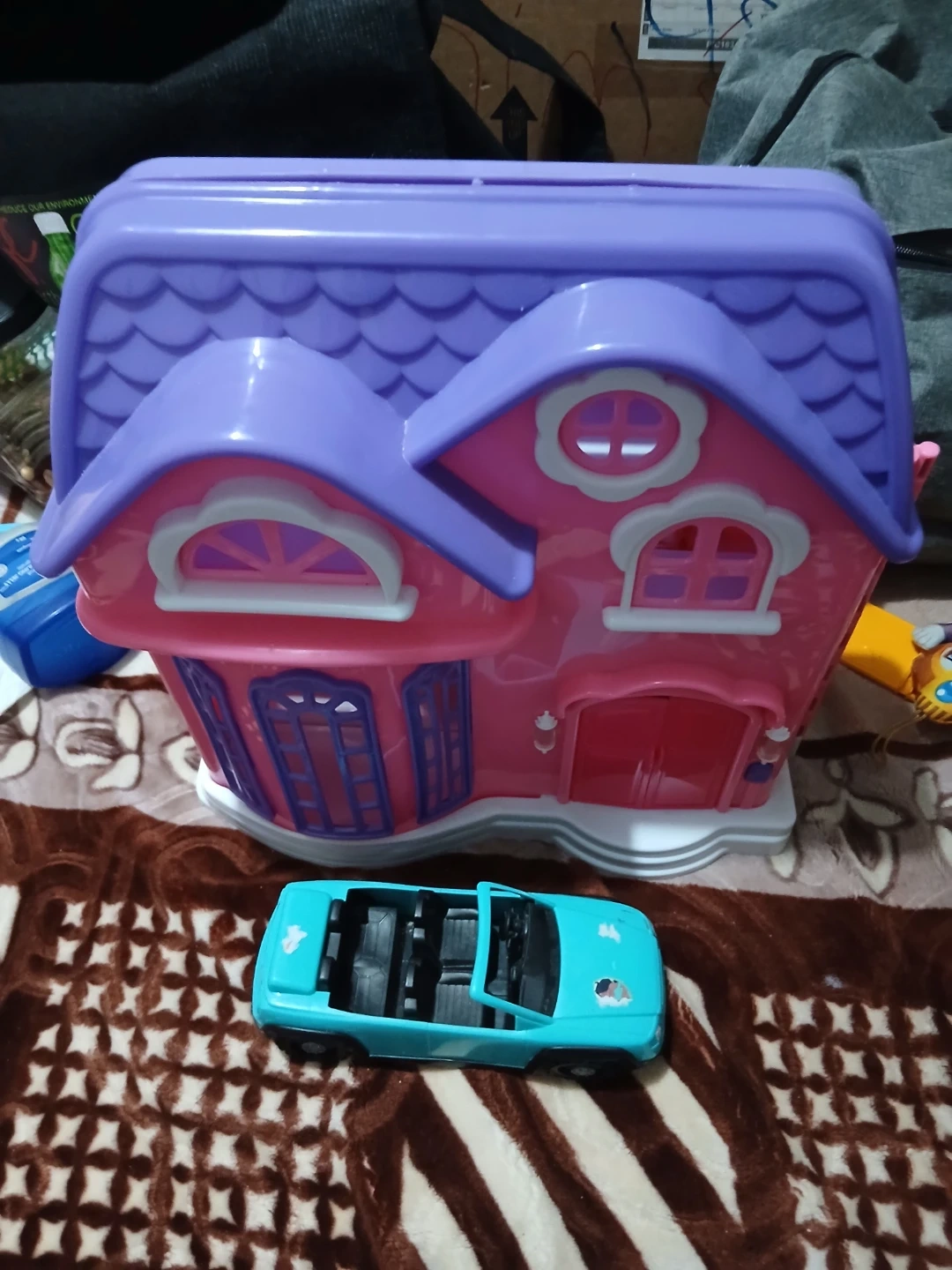 This is a fun toy set featuring a pink and purple dollhouse with decorative windows and a red door. It also includes a teal convertible toy car with detailed interior seating. Perfect for imaginative play!
