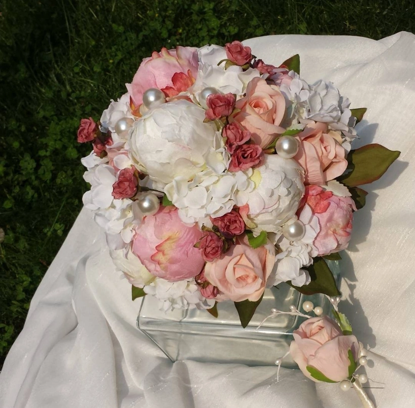 Beautiful wedding bouquet featuring white, pink, and blush-coloured flowers, accented with pearls. It also comes with a matching boutonniere for the groom or groomsmen. Perfect for a wedding or special event!