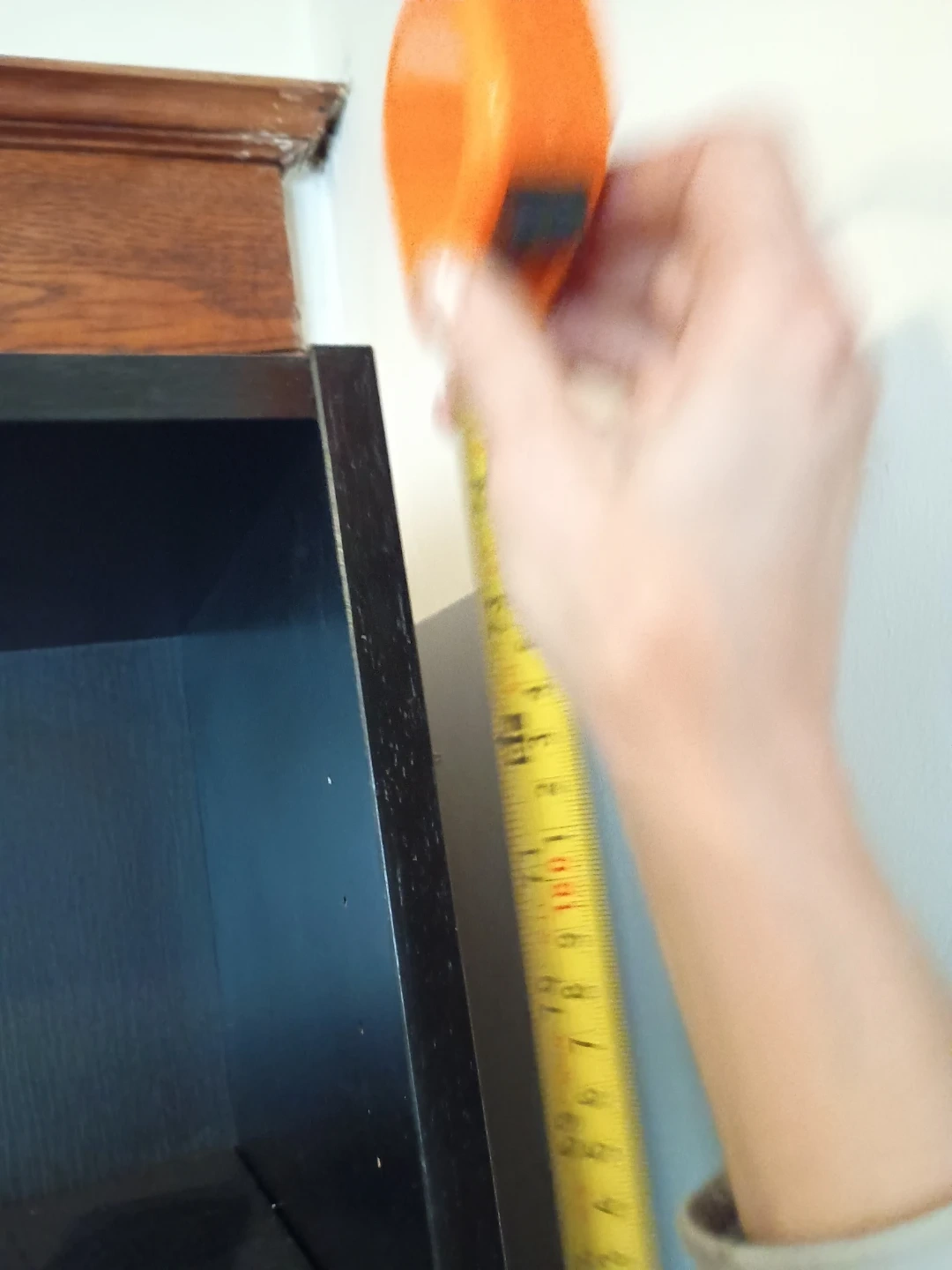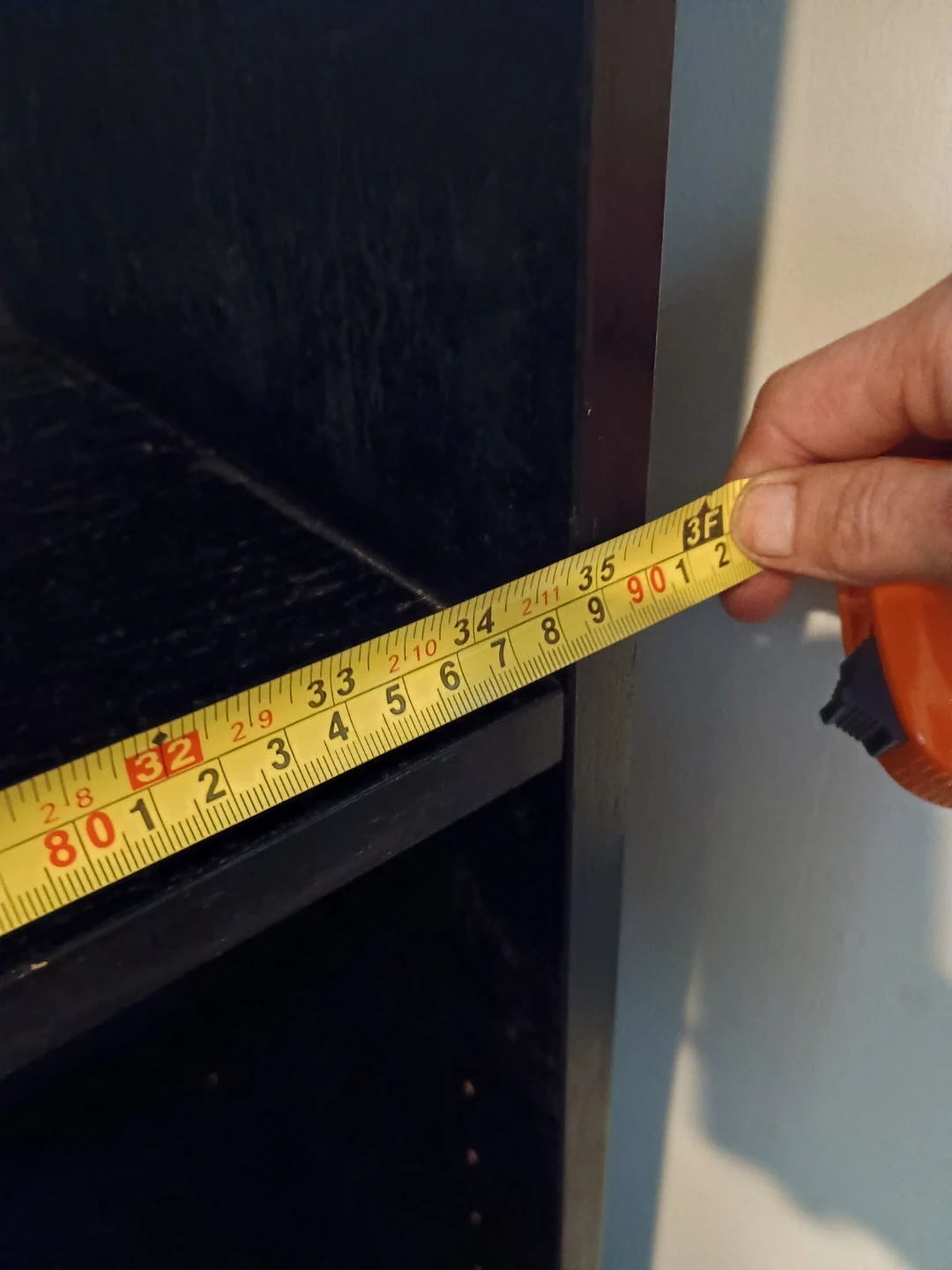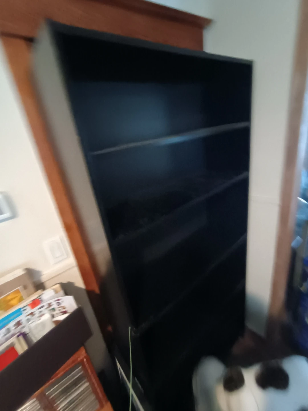 Tall black bookshelf with six shelves. Shelf depth is approximately 11 inches. Great for organizing books and decor. 76 inch tall. The wood is firm.
