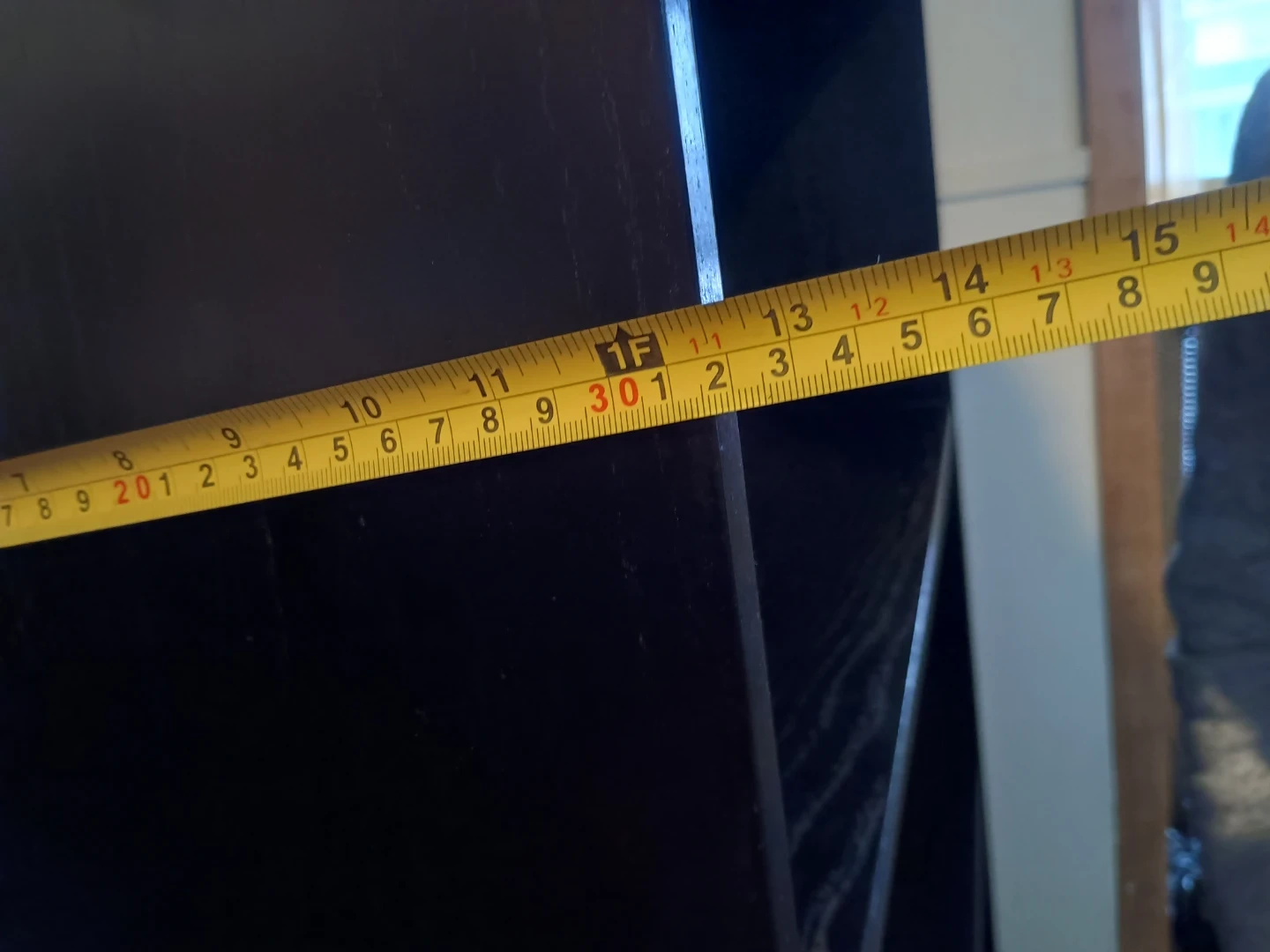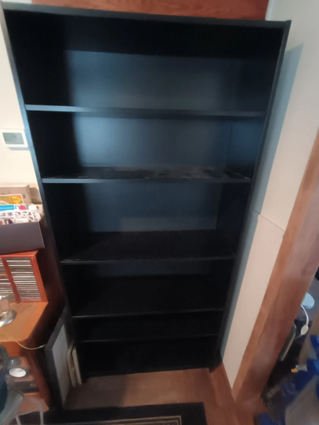 Tall black bookshelf with six shelves. Shelf depth is approximately 11 inches. Great for organizing books and decor. 76 inch tall. The wood is firm.