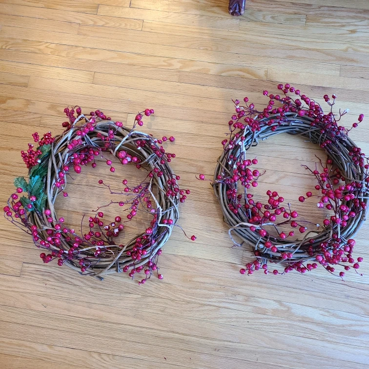 Selling two 18" wicker wreaths, perfect for adding a touch of festive charm to your home this holiday season! They're decorated with bright red berries and have a lovely natural look.