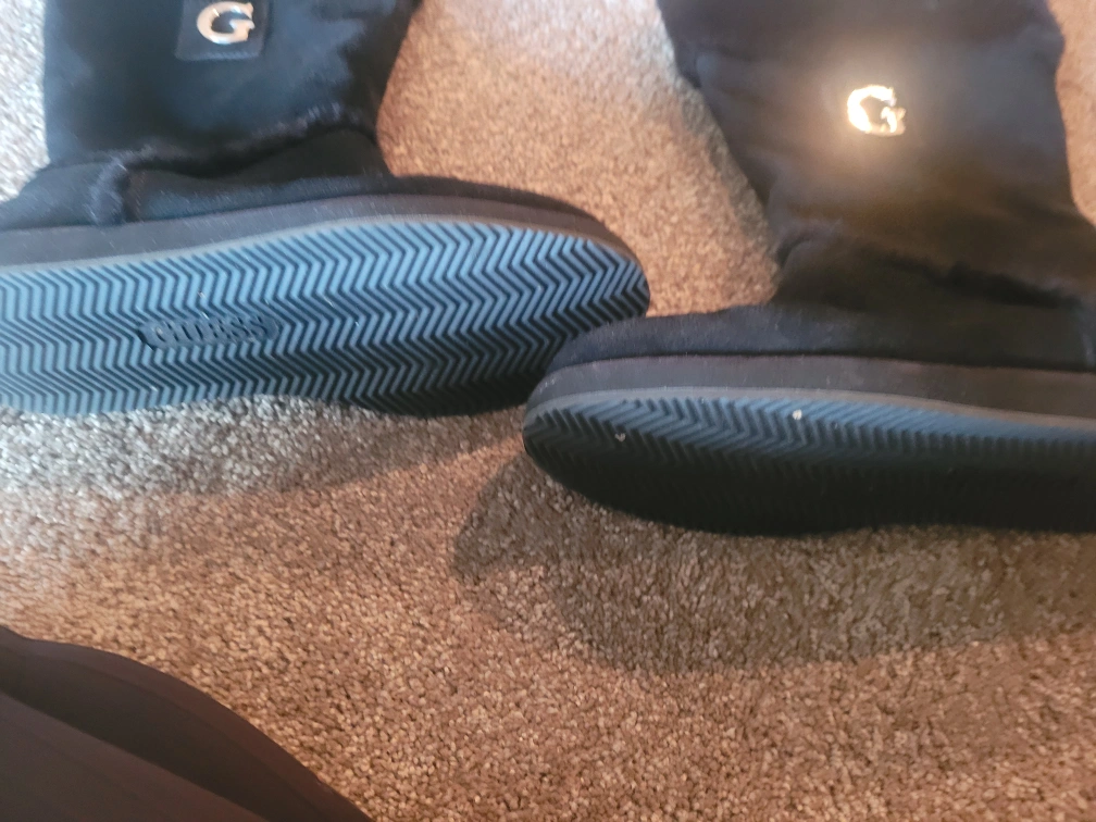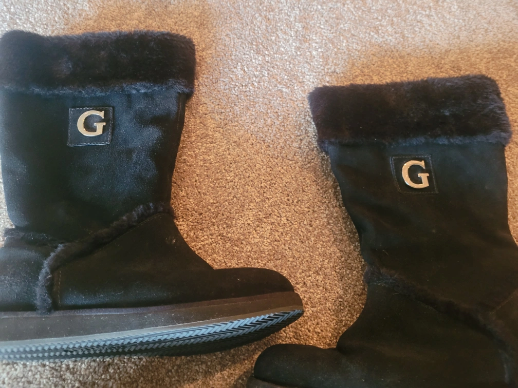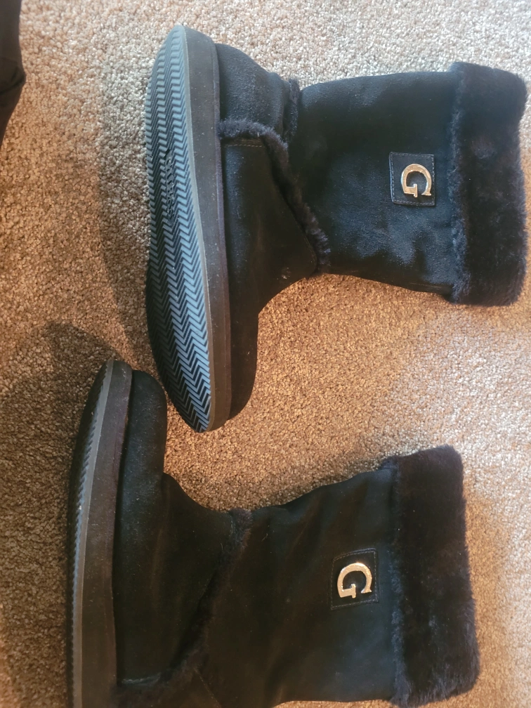 Black G by Guess winter boots with faux fur trim. Made with a suede-like material. Size is medium. Features a durable sole for traction.