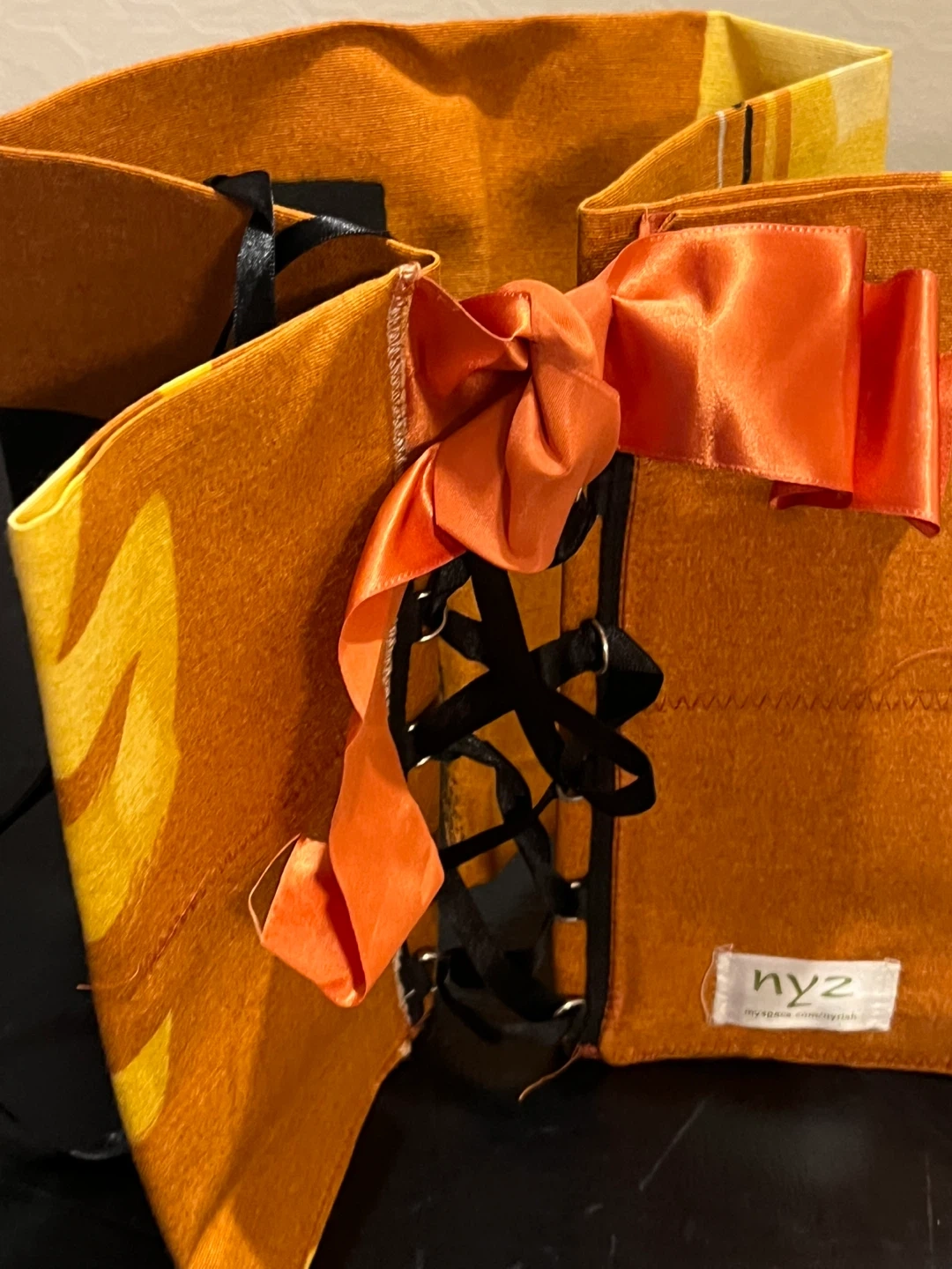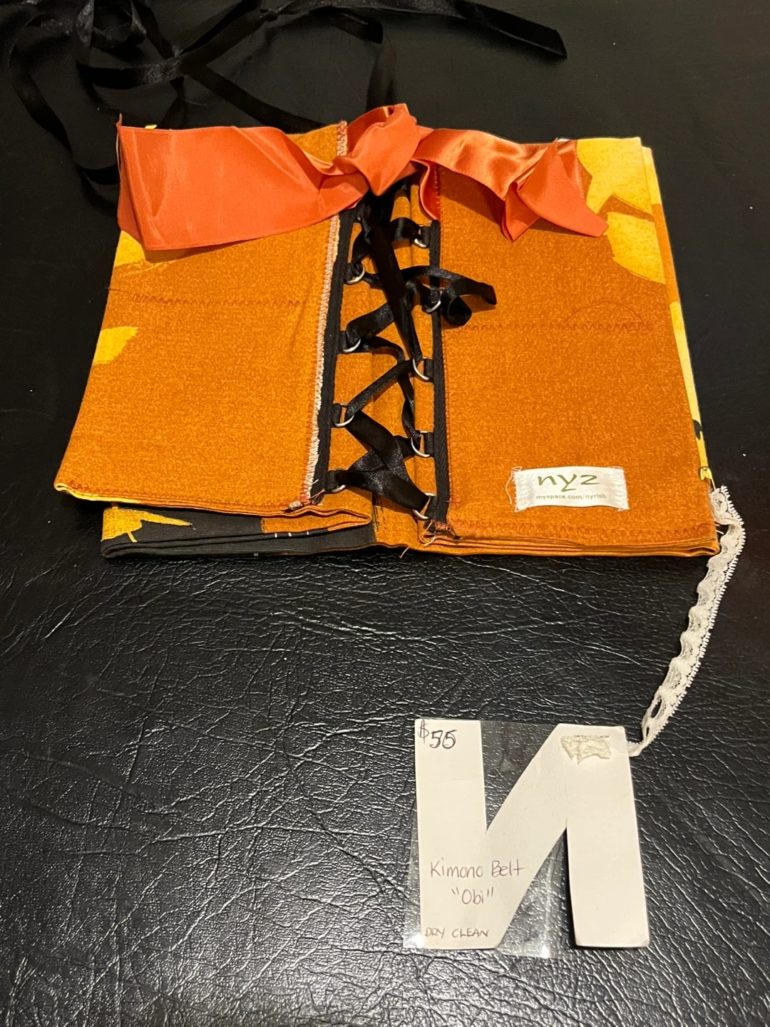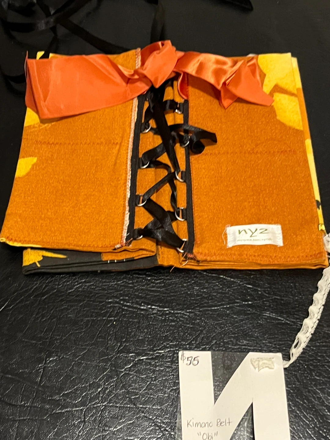 This is a NYZ Kimono Belt "Obi". It's orange with black accents and features a black lace-up corset style front with an orange satin bow. The belt is made of fabric. Perfect for adding a unique touch to an outfit!