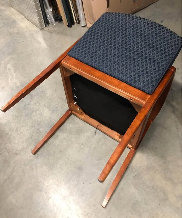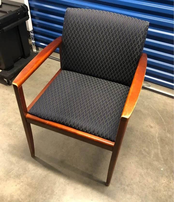 This upholstered arm chair features a dark blue patterned fabric seat and backrest. It has a warm-toned wooden frame and armrests. The chair offers a comfortable seating option. Dimensions: Seat height approximately 18 inches.