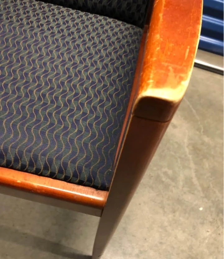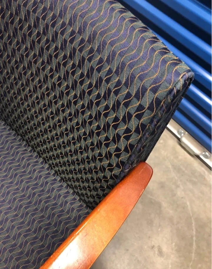 This upholstered arm chair features a dark blue patterned fabric seat and backrest. It has a warm-toned wooden frame and armrests. The chair offers a comfortable seating option. Dimensions: Seat height approximately 18 inches.