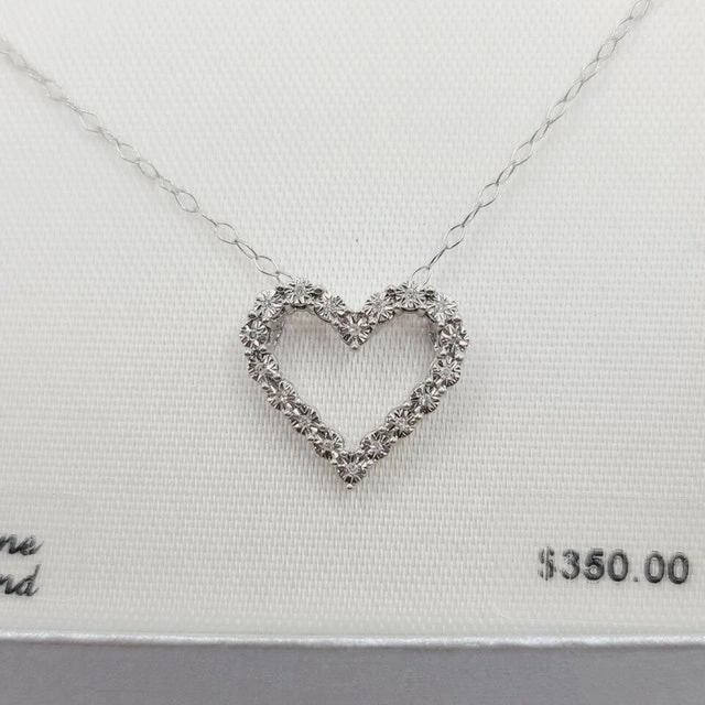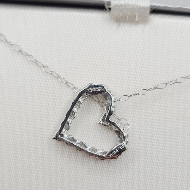 Brand new in the box. Retail value $490 CAD / $350 USD. Features 20 diamonds (I, J color, I2/I3 clarity) in a heart pendant with a Singapore chain, 18" length, spring ring closure. Sterling silver with prong setting. Polished finish. Clean with a cloth. Pick up area Sheppard & Don Mills.