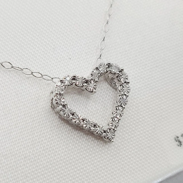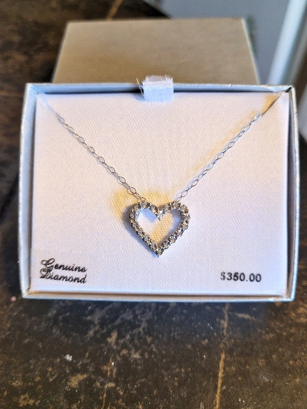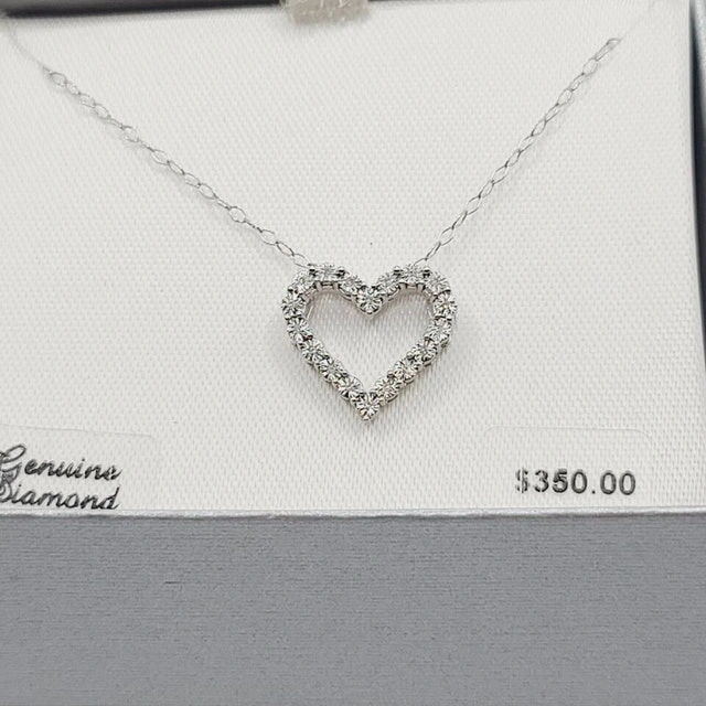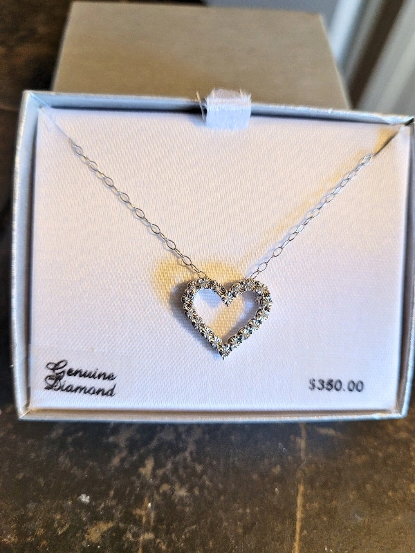 Brand new in the box. Retail value $490 CAD / $350 USD. Features 20 diamonds (I, J color, I2/I3 clarity) in a heart pendant with a Singapore chain, 18" length, spring ring closure. Sterling silver with prong setting. Polished finish. Clean with a cloth. Pick up area Sheppard & Don Mills.