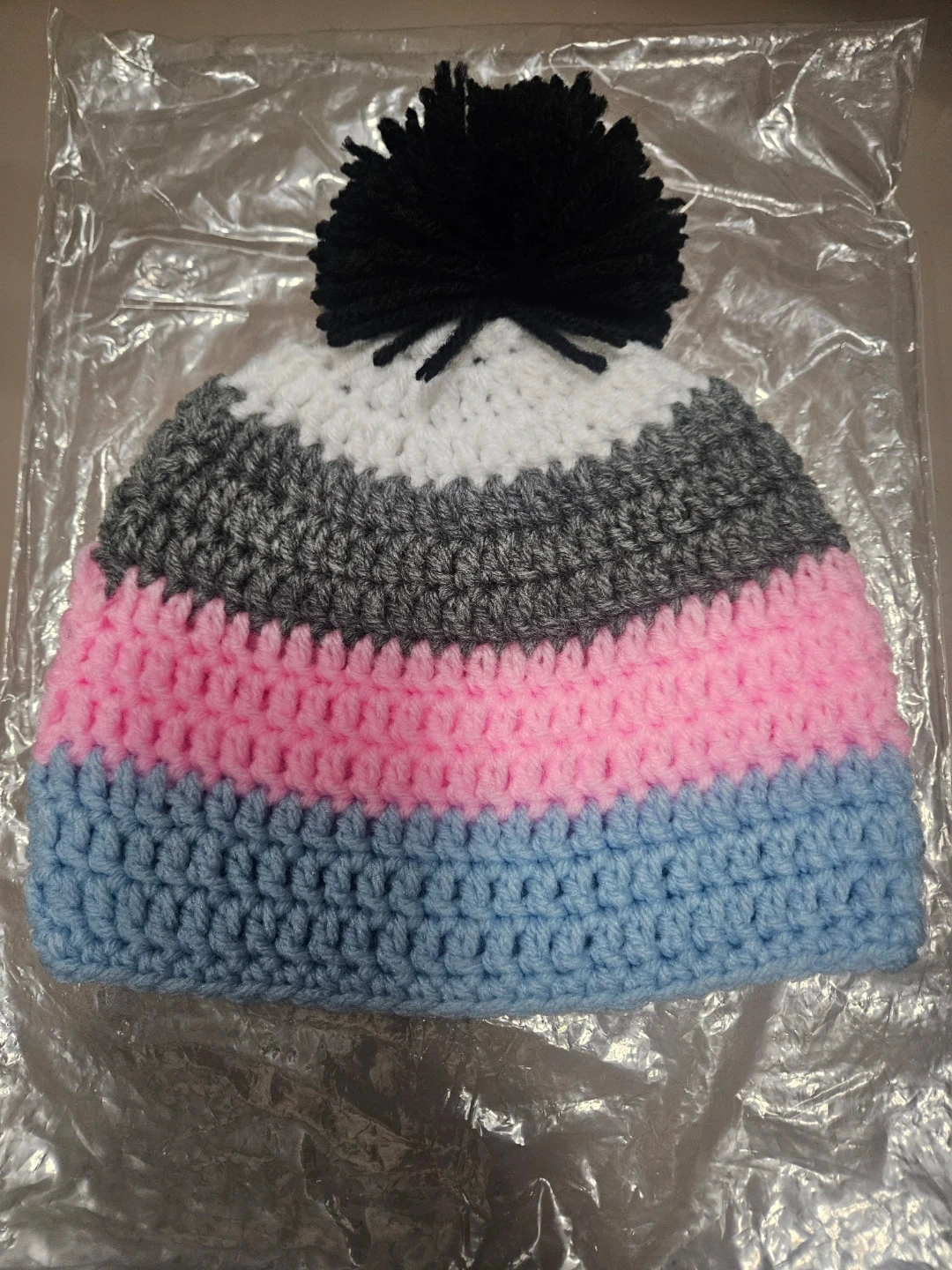 Hand-crocheted beanie featuring stripes of blue, pink, grey, and white. Topped with a black pom pom. It's a fun, colorful accessory!
