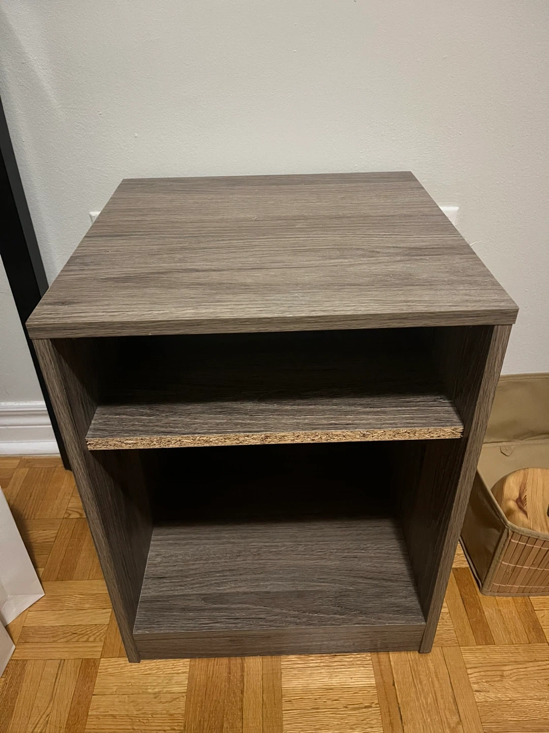 This side table features a grey wood finish and two open shelves. It's a handy piece for a bedroom or living area. Dimensions are approximately 15" wide x 15" deep x 20" high.