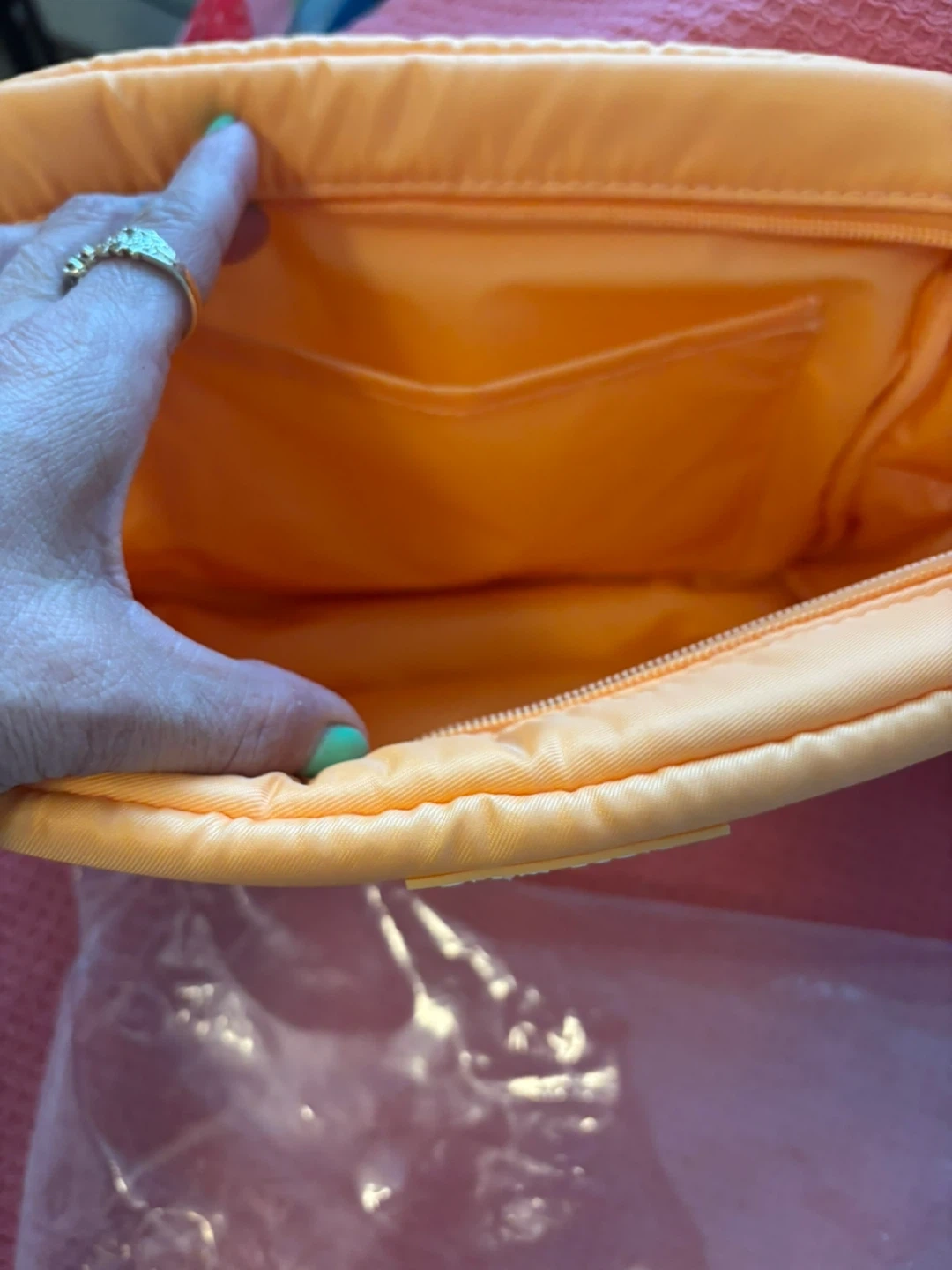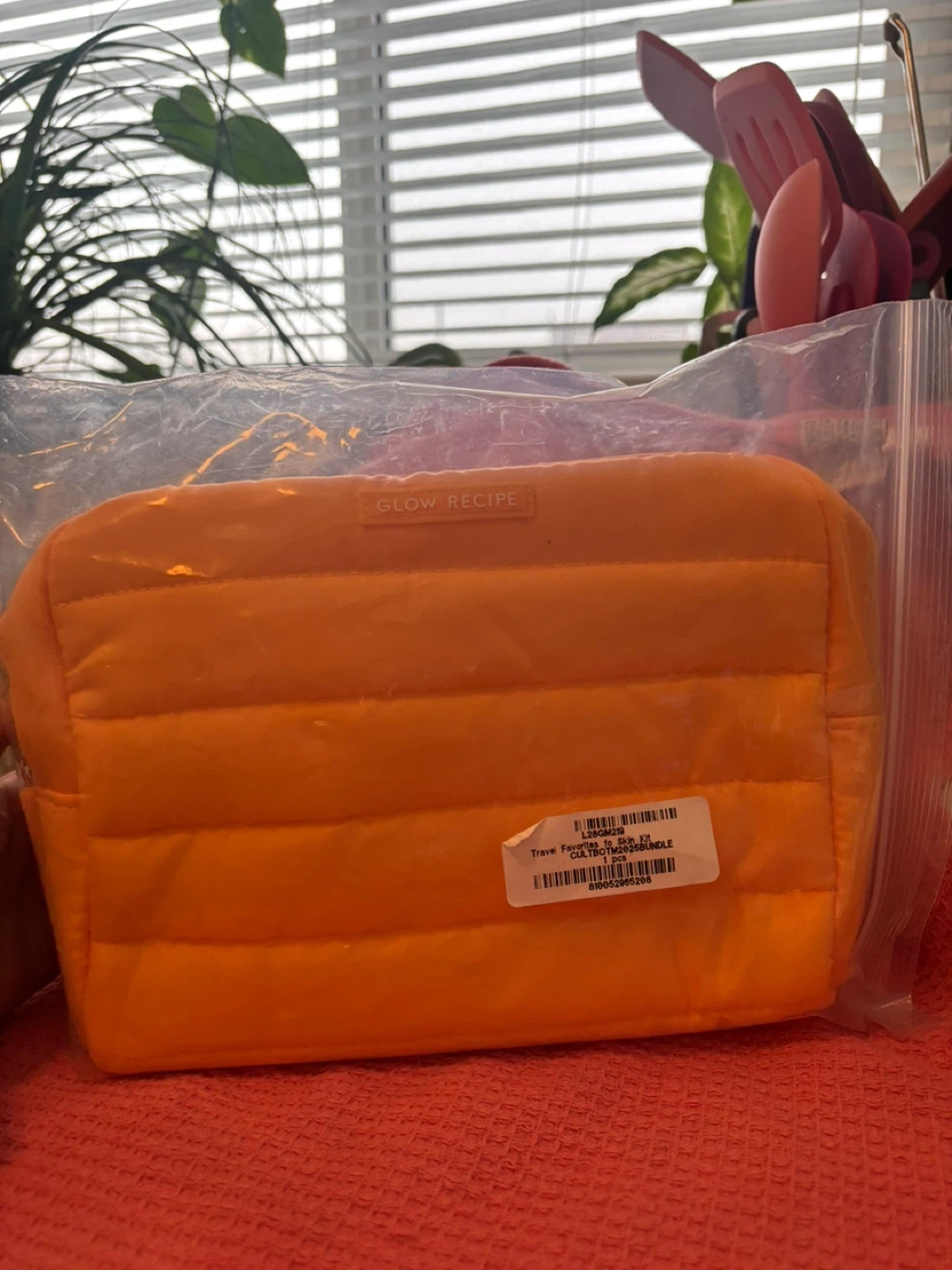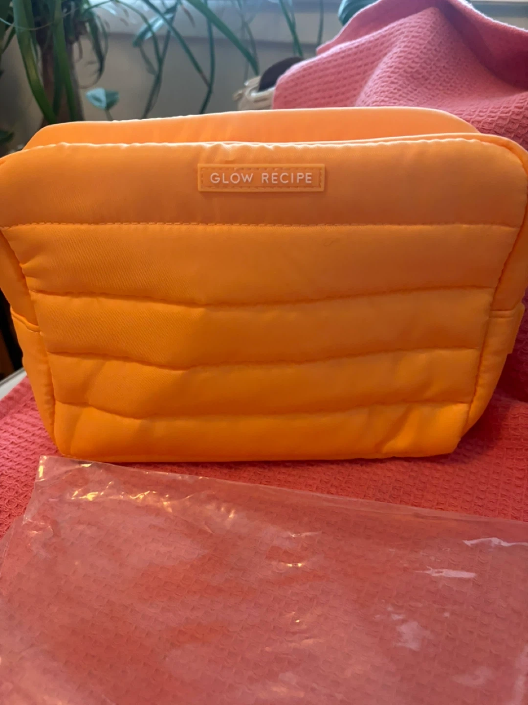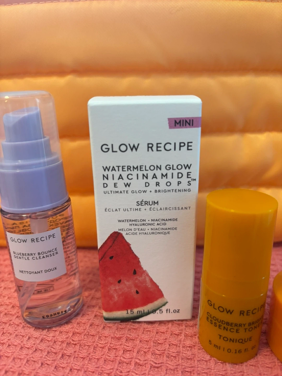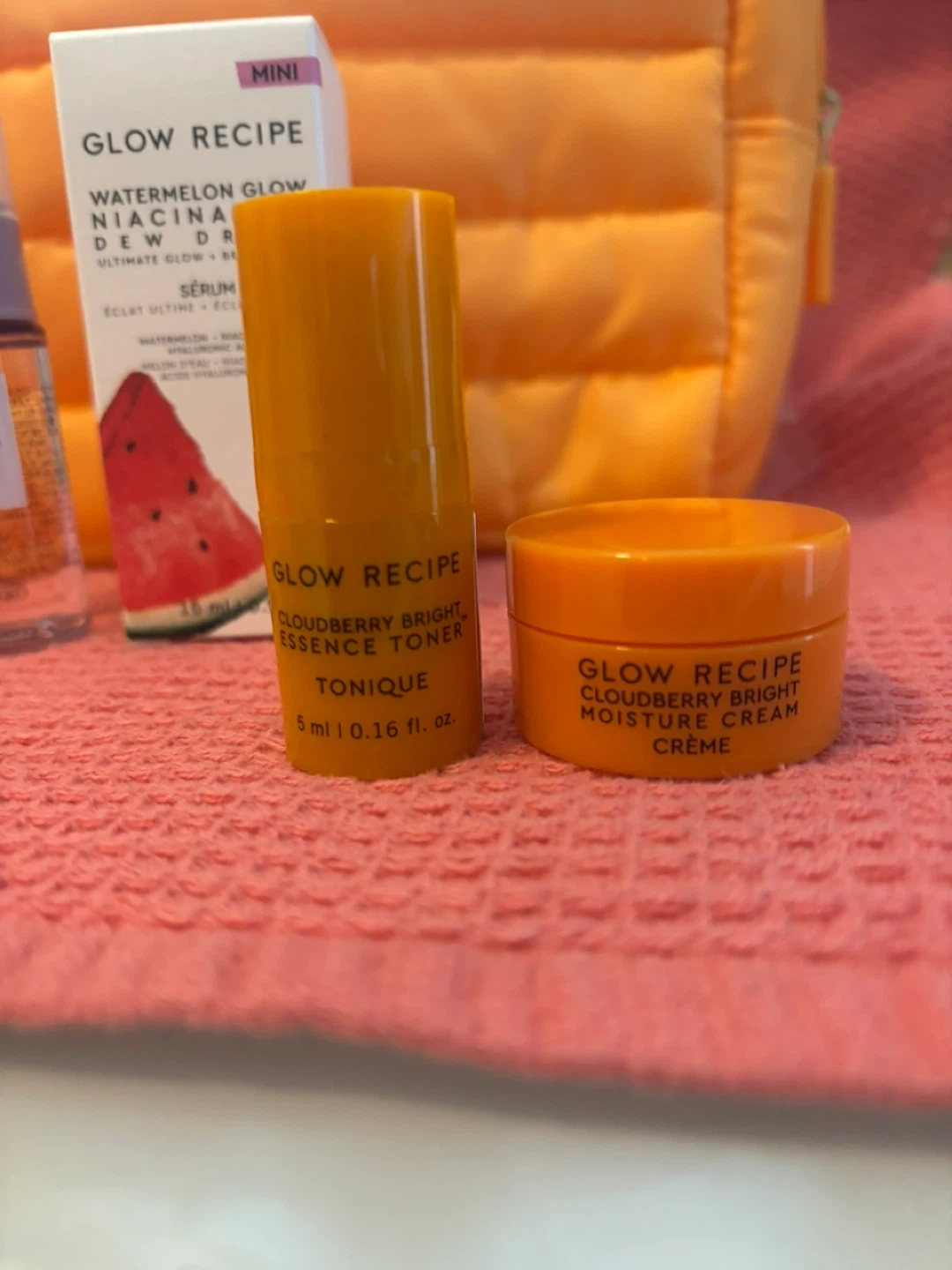 Orange Glow Recipe puffer travel bag. Includes mini Watermelon Glow Niacinamide Dew Drops, Blueberry Bounce Gentle Cleanser, and Cloudberry Biotic Essence Toner. Perfect for on-the-go skincare!