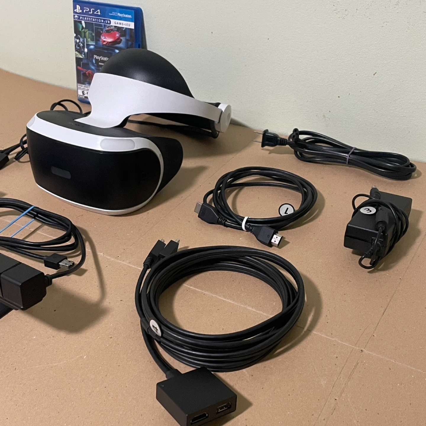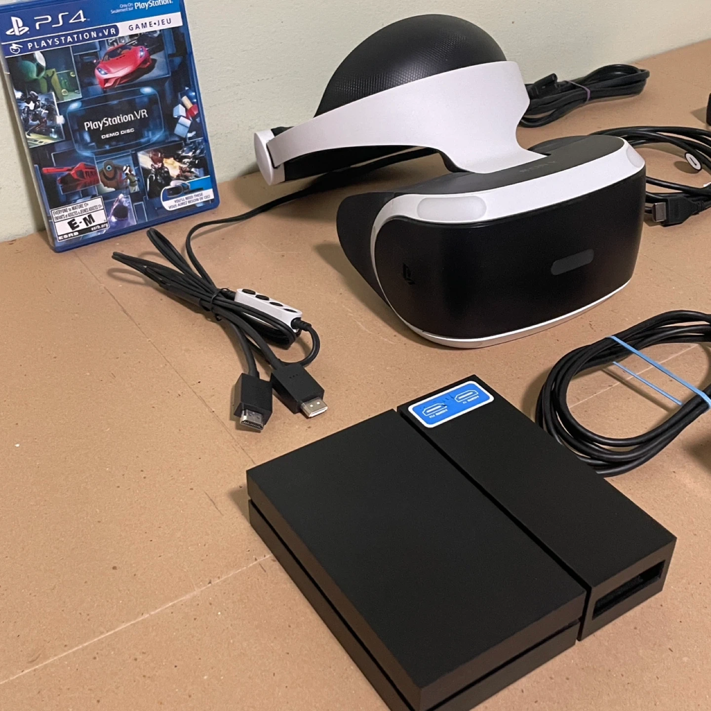 PlayStation VR Virtual Reality gaming headset bundle for PlayStation 4 includes everything except the move controllers. Some games do not require the motion controllers. It is in excellent condition and includes a game demo disc.