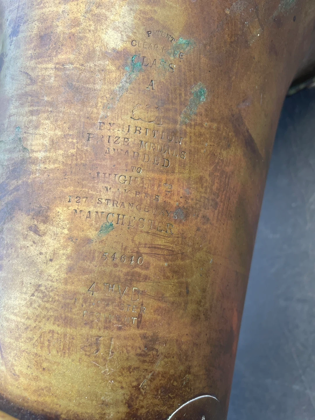 This is an antique brass baritone horn. It's stamped with 'Patent Clear Pipe, Class A, Exhibition Prize Medals Awarded to Higham's Makers, 127 Strangeways, Manchester'. It also has a serial number '54640'. This is a display piece only.