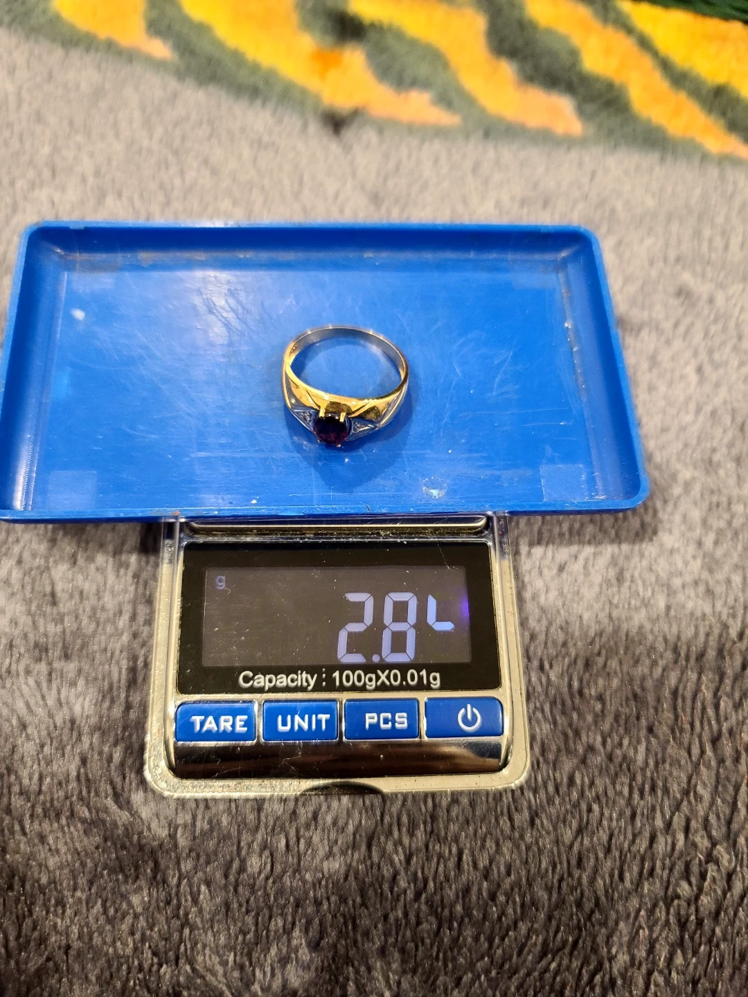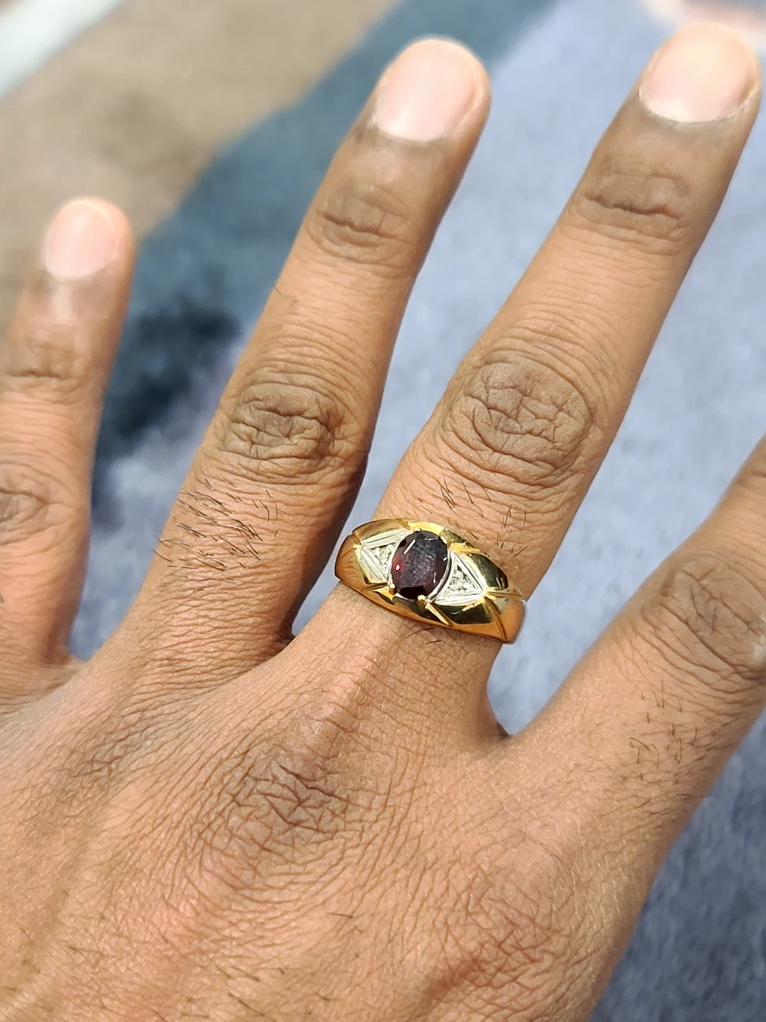 A beautiful 10K gold ring featuring a deep red garnet and small accent diamonds. This ring weighs 2.84 grams. It's a unique piece with a classic design.