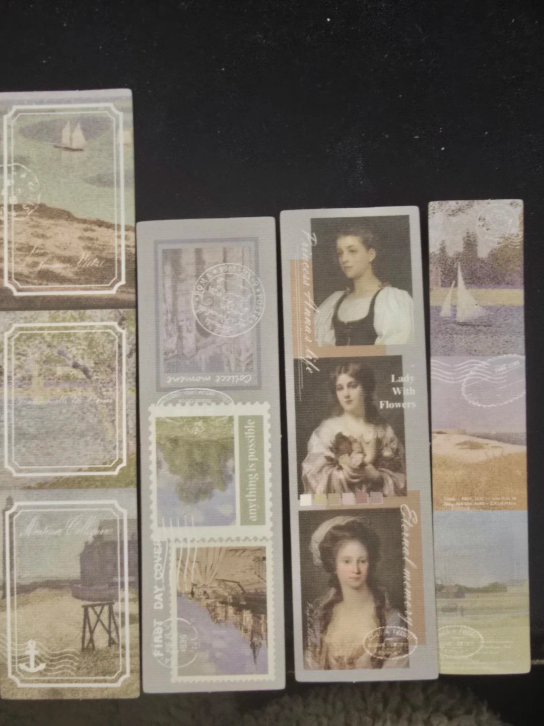 A set of decorative stickers featuring vintage art and nature scenes for journalling & etc. Designs include classical paintings, landscapes, and floral motifs.