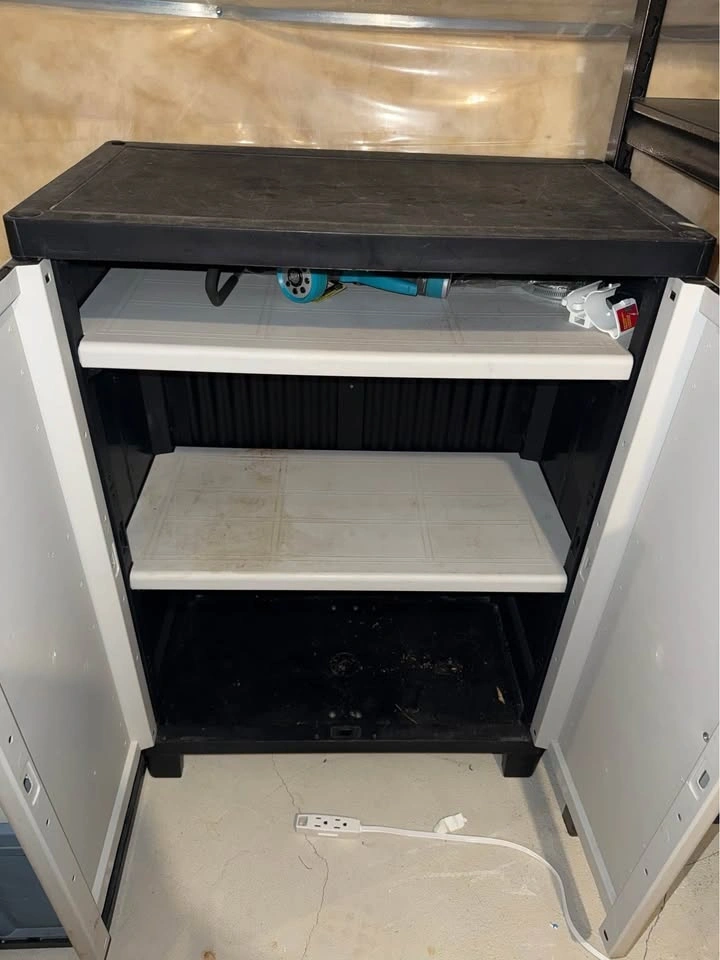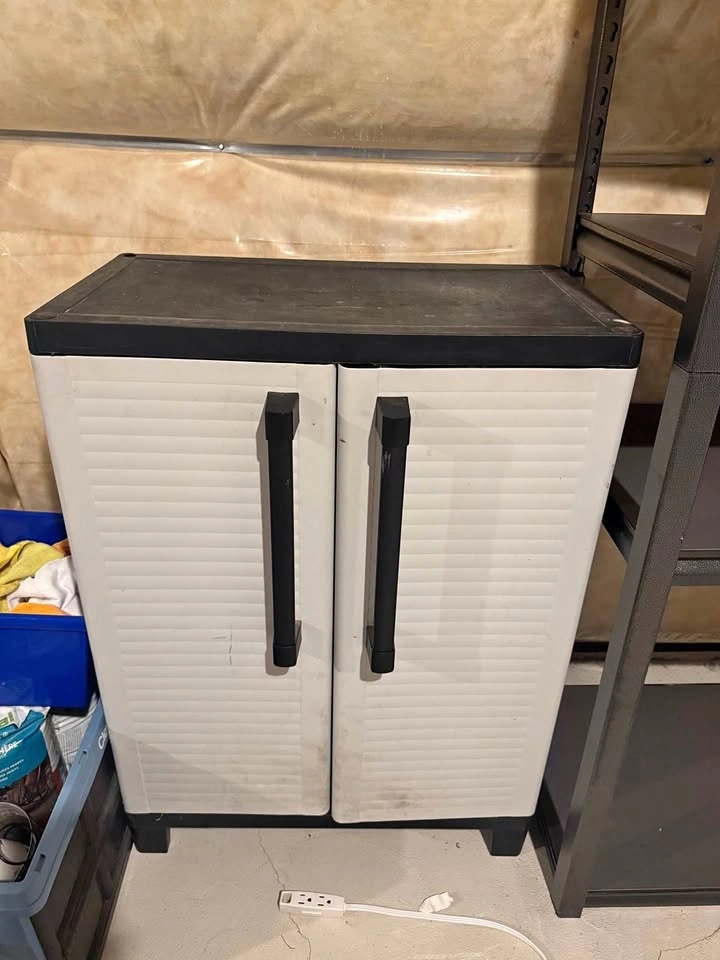 Need extra storage for your garage, basement, or shed? I'm clearing out this plastic 2-door utility cabinet. Material: Durable resin/plastic (won’t rust or peel). Storage: Includes 2 interior shelves for organizing tools, cleaning supplies, or pantry items. Condition: Used and needs a quick wipe-down, but fully functional with working doors and handles. Lightweight: Very easy to move and transport.