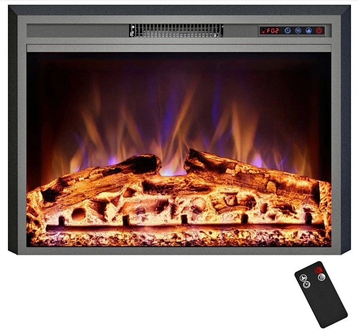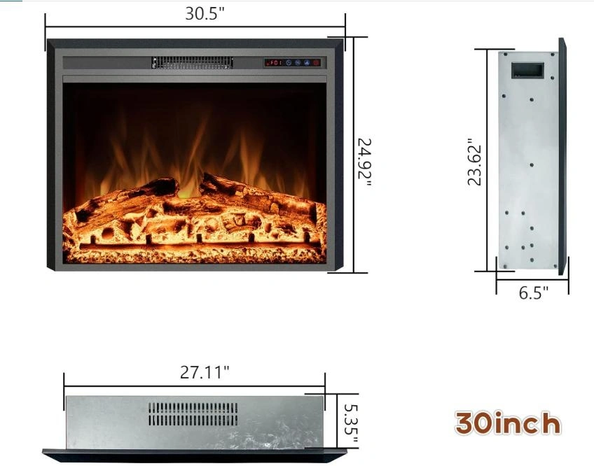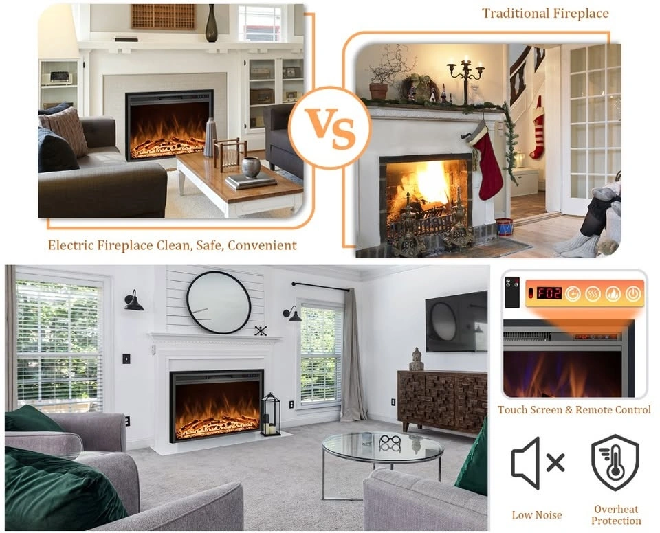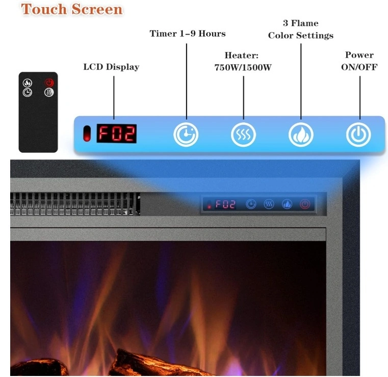 Easy to install, just insert the fireplace into your mantle for a space-saving setup. It plugs into a standard 120V AC outlet. Features realistic flame effects with 3 color options and 2 heat settings (1500W/750W) to suit different room sizes. You can enjoy the ambiance with or without heat. The built-in 1-9 hour timer is convenient and energy-saving. All functions are easily controlled via the remote or the control panel, with status shown on the LCD display. This electric stove offers a classic design with simulated wood and lifelike flames for an immersive experience, without the mess or danger of traditional fireplaces. It operates quietly for a comfortable and cozy environment. Its vintage appearance makes it suitable for TV cabinets, fireplace walls, or bookshelves.