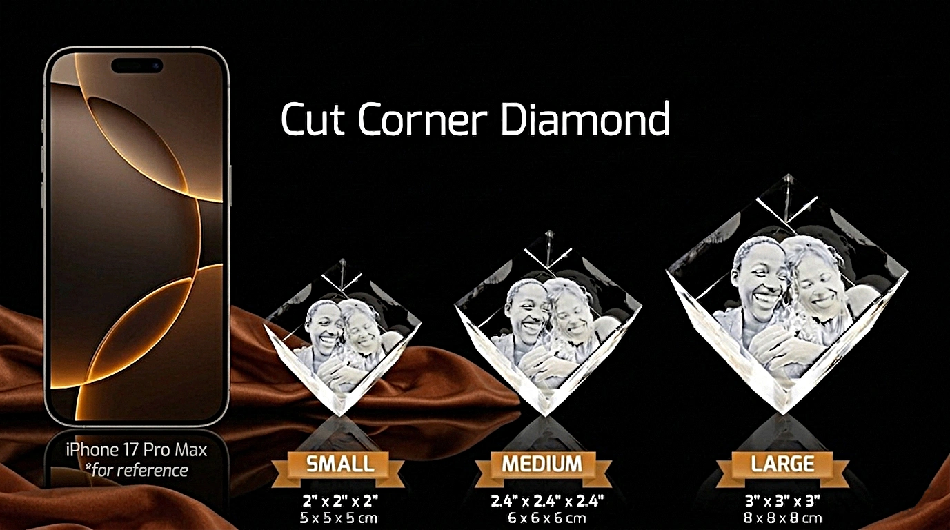 Add a touch of elegance to any space with these beautifully engraved crystal cut corner diamonds. Each piece is precision laser-engraved inside the crystal, creating a stunning effect that never fades.