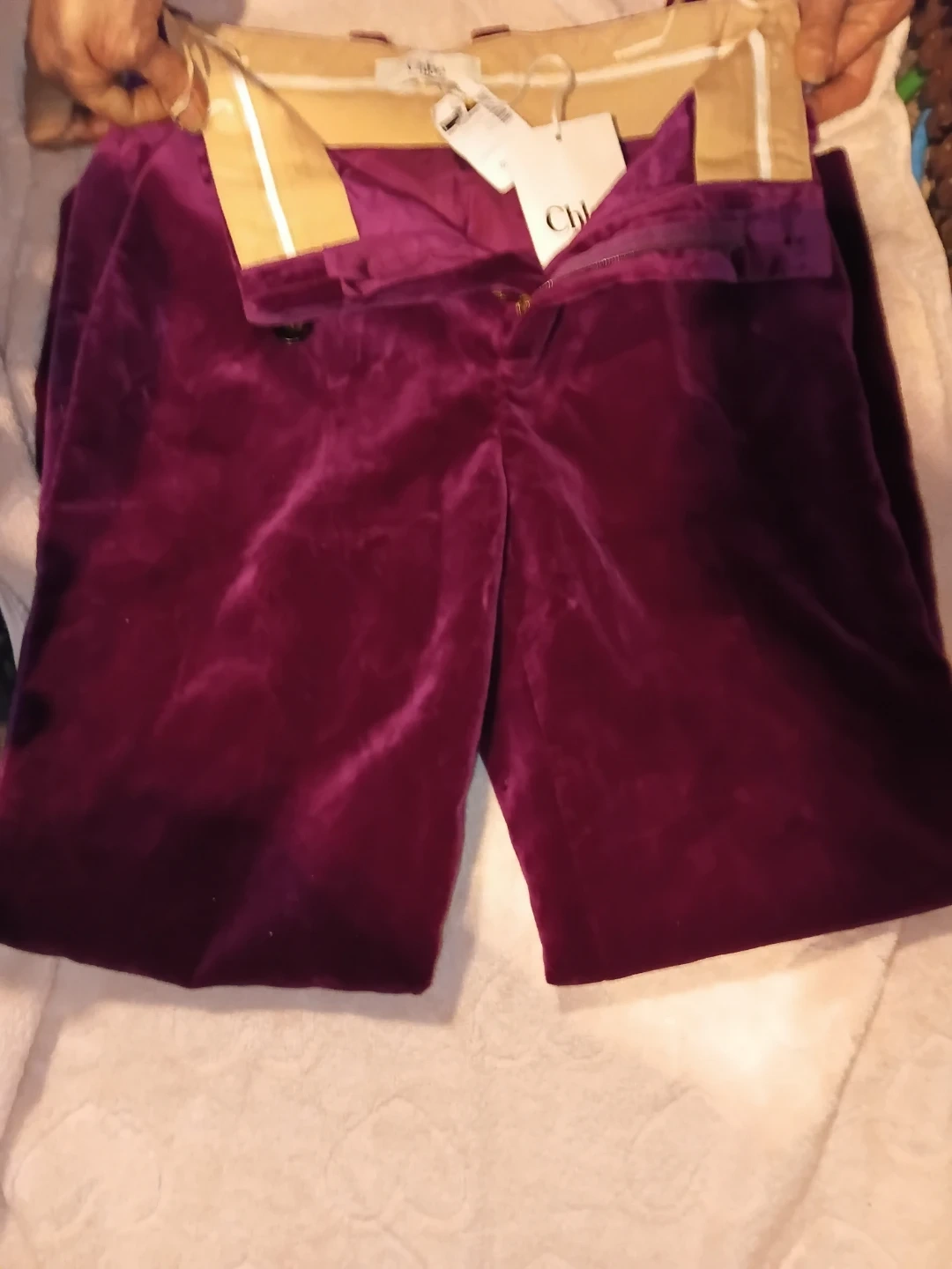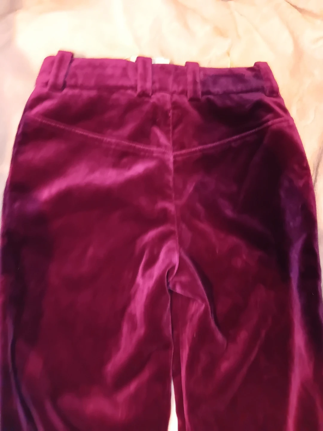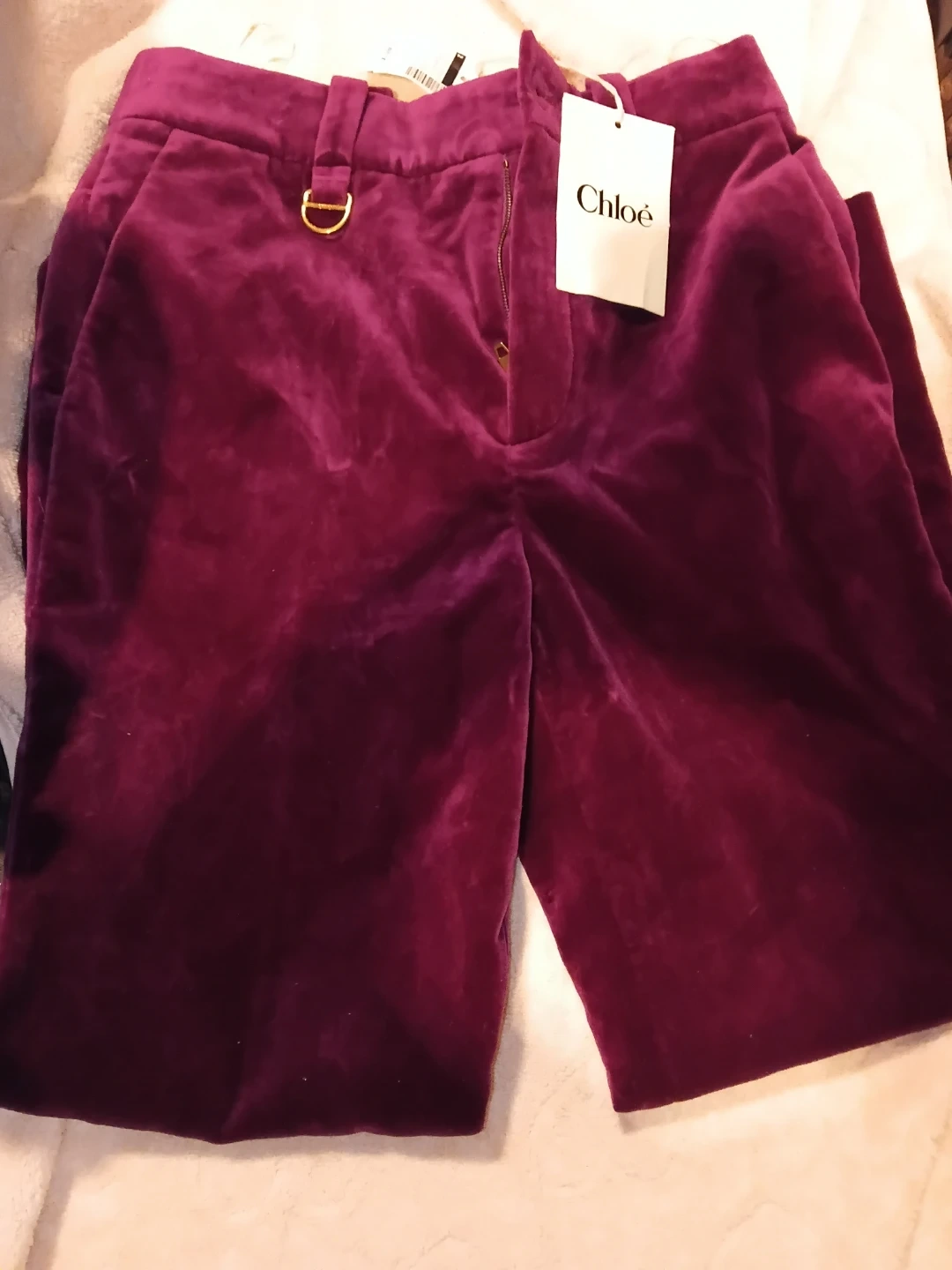 Brand new Chloé velvet trousers in a rich plum colour. Features a zipper closure and gold hardware details. It's a size 2.