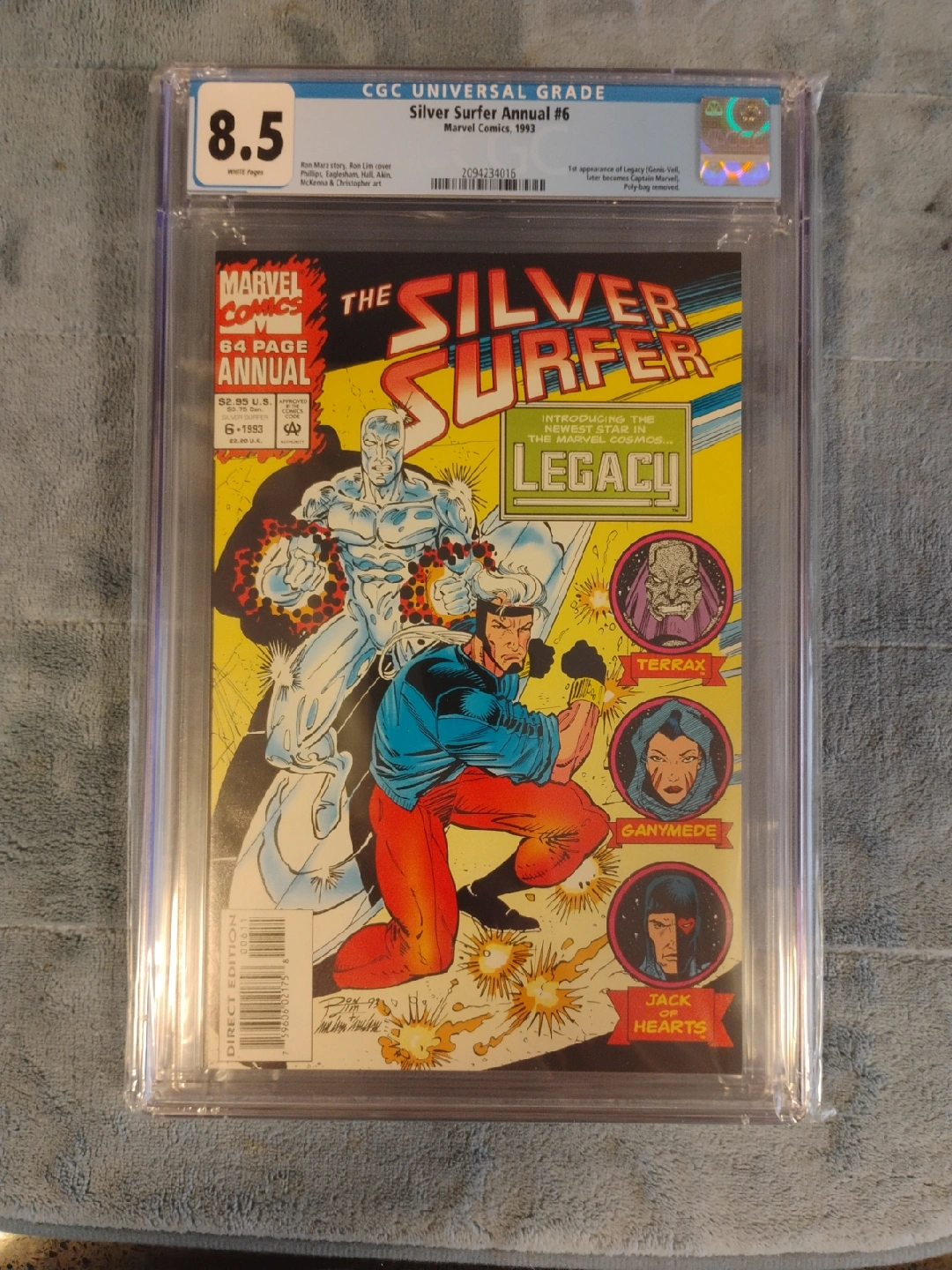 Selling a CGC Universal Grade Silver Surfer Annual #6 from Marvel Comics, 1993. It's graded at 8.5 with white pages. This comic features the first appearance of Legacy (Genis-Vell, later becomes Captain Marvel). The story is by Ron Marz, with a cover by Ron Lim. Art by Phillips, Eaglesham, Hall, Akin, McKenna & Christopher