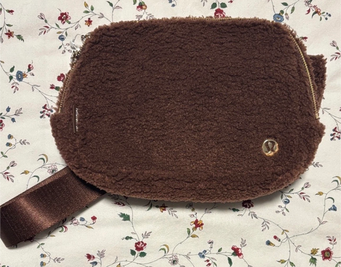 Lululemon belt bag in a cozy fleece material. It's a large size, perfect for keeping essentials close by. Features a zippered main compartment and an adjustable strap.