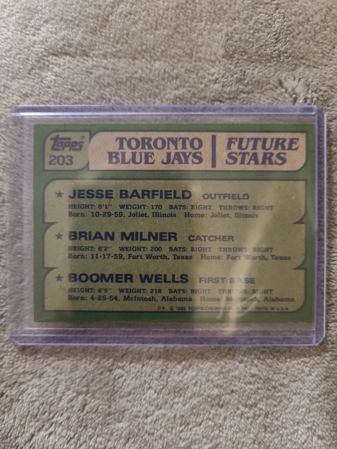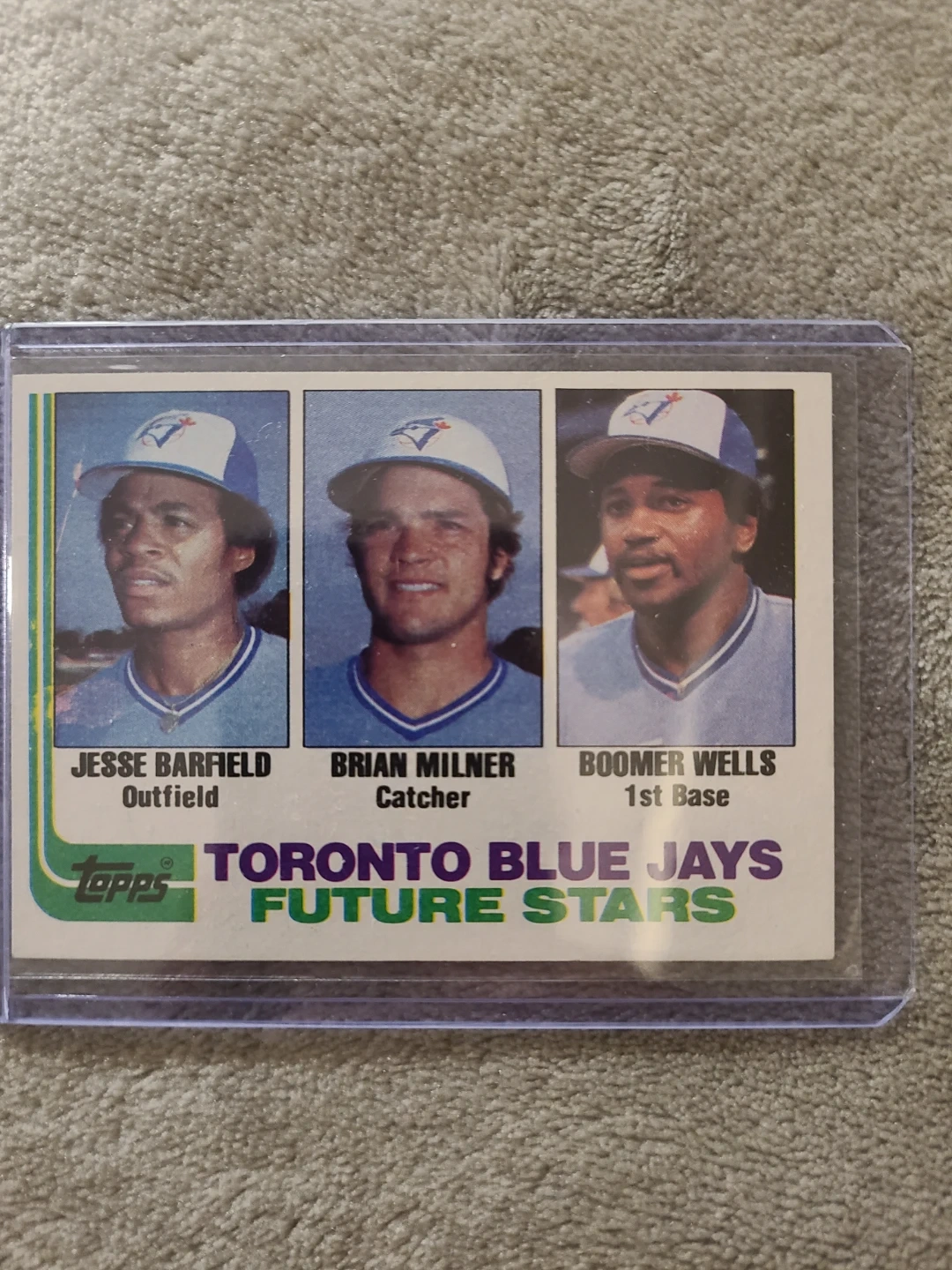 This 1982 Topps baseball card features the Toronto Blue Jays Future Stars, including Jesse Barfield, Brian Milner, and Boomer Wells. It is a collectible item for baseball fans.(Jesse rookie card)