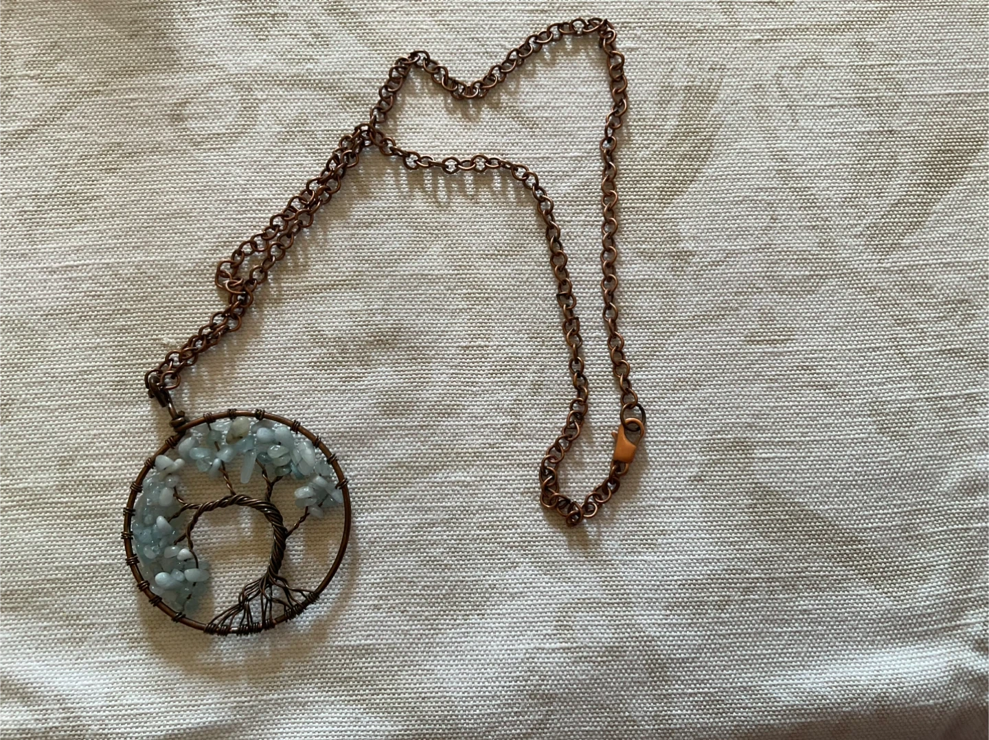 Antiqued copper chain with The Tree of Life pendant is made with wire wrapping and accented with small Aquamarine coloured stones. The birthstone for March. It's a lovely accessory for everyday wear.