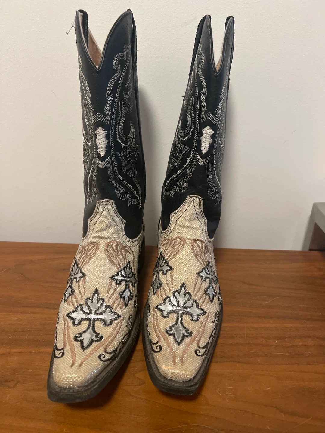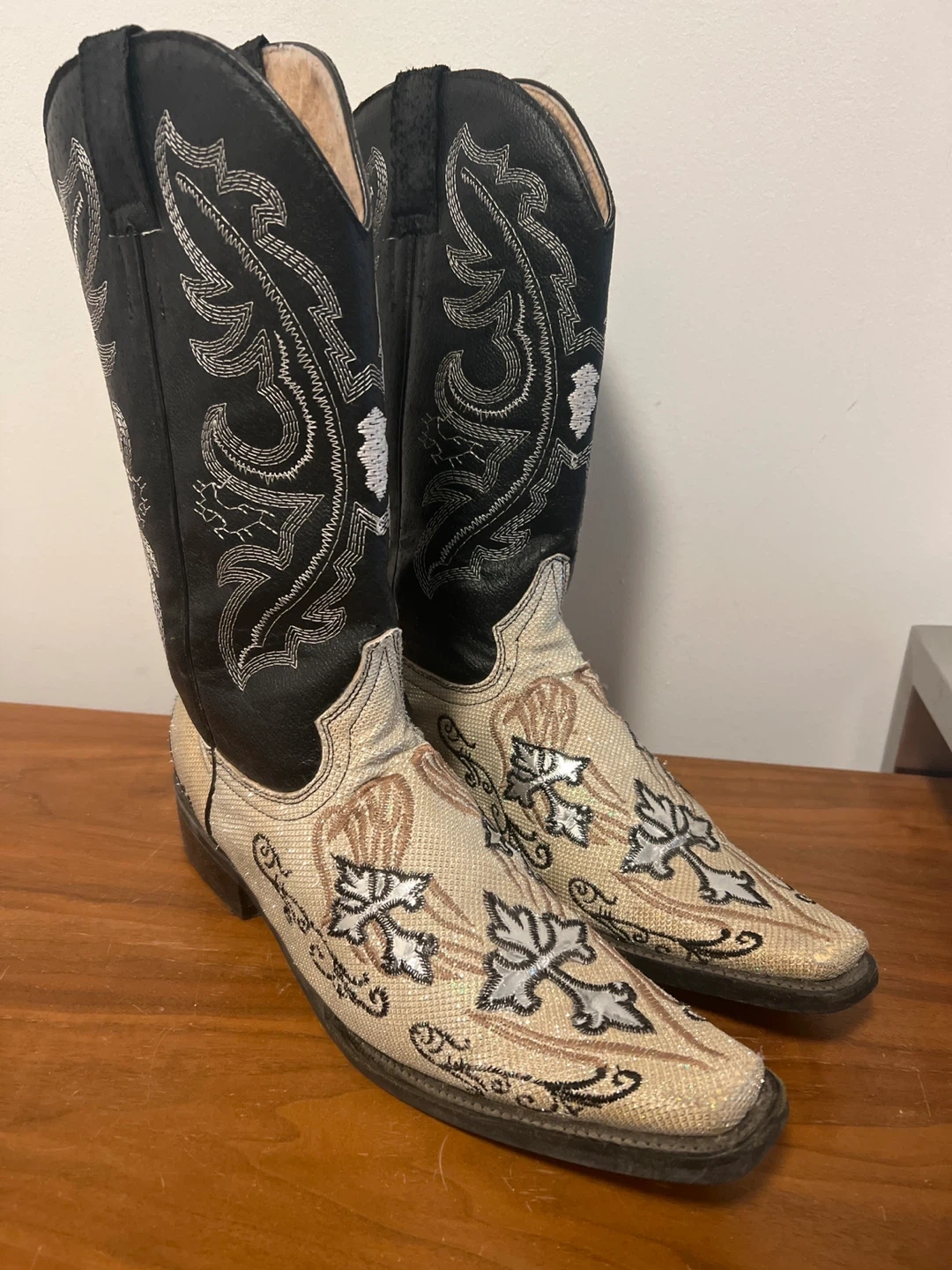 Stylish cowboy boots with intricate embroidery. Features a black shaft and a shimmering patterned foot. These boots are perfect for adding a western flair to your outfit!
