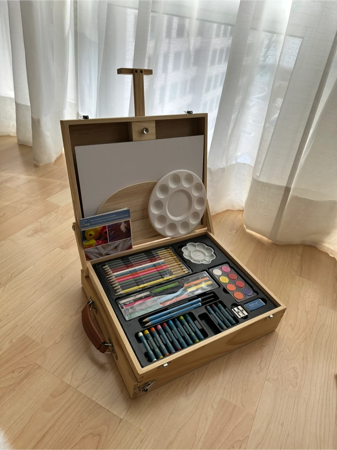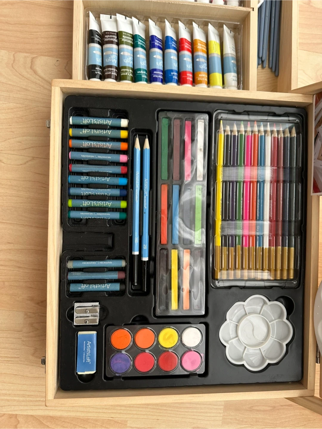 This Artist’s Loft art set comes in a wooden case. Acrylic paint is not included, but the other tubes are unopened. The condition of the remaining items can be seen in the photos.