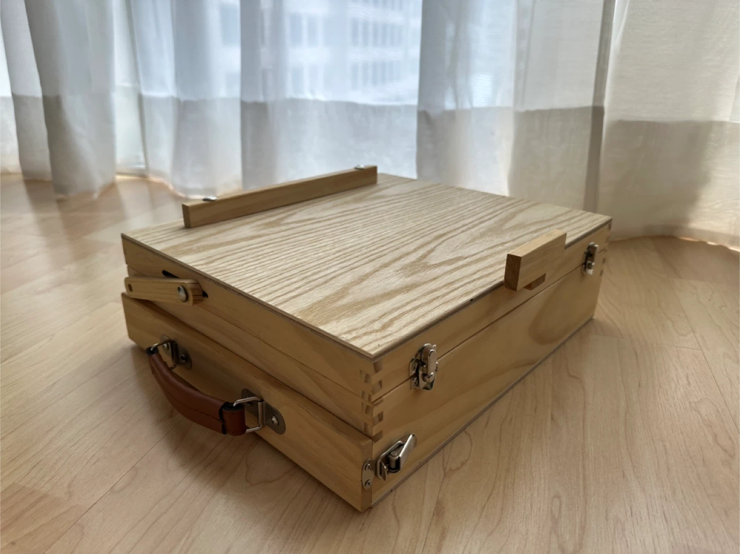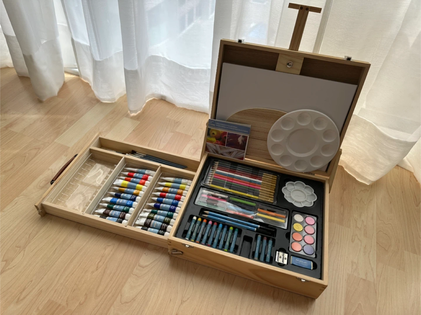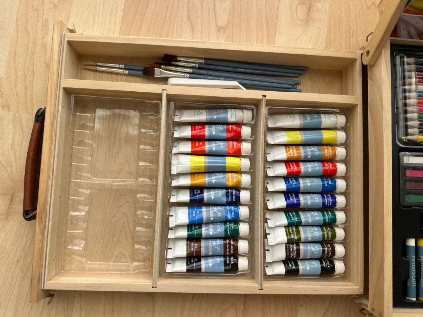 This Artist’s Loft art set comes in a wooden case. Acrylic paint is not included, but the other tubes are unopened. The condition of the remaining items can be seen in the photos.