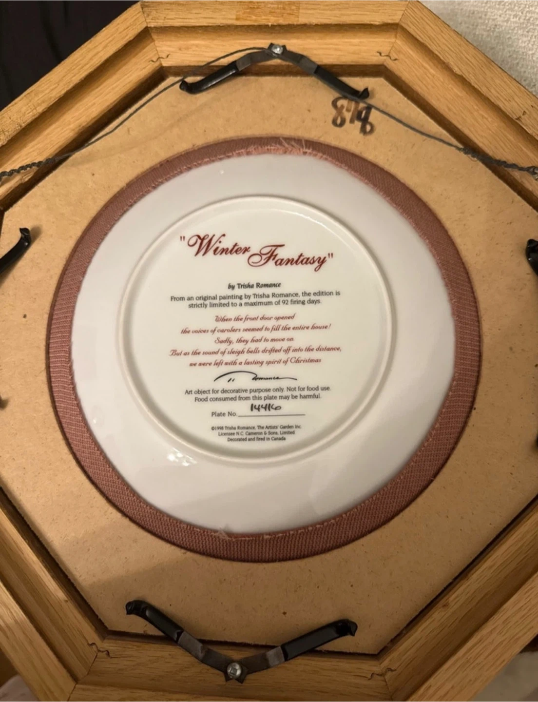 This decorative plate features an original painting by Trisha Romance, titled "Winter Fantasy". It's part of a limited edition and is strictly for decorative use, not for food consumption. The plate is framed and ready to hang.