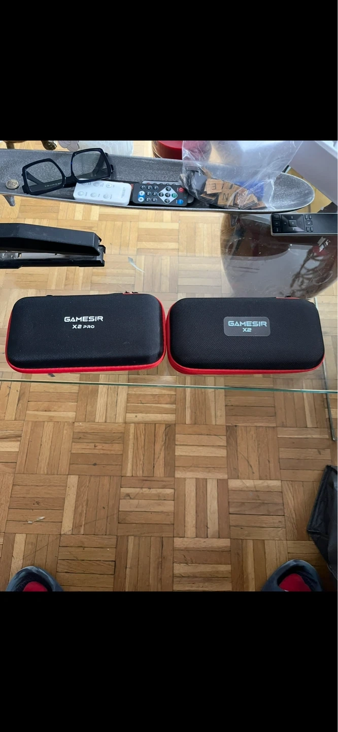 Two Gamesir X2 Pro controllers for mobile gaming. These controllers are in cases and ready for use. They feature a white and black design.