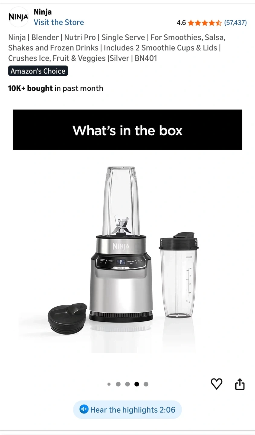 This is a Ninja Nutri-Blender Pro, model BN401. It's silver and includes two 24-oz. single-serve cups with lids. Auto-IQ technology provides intelligent blending programs. Comes with original packaging and instructions. Was $109.99 originally