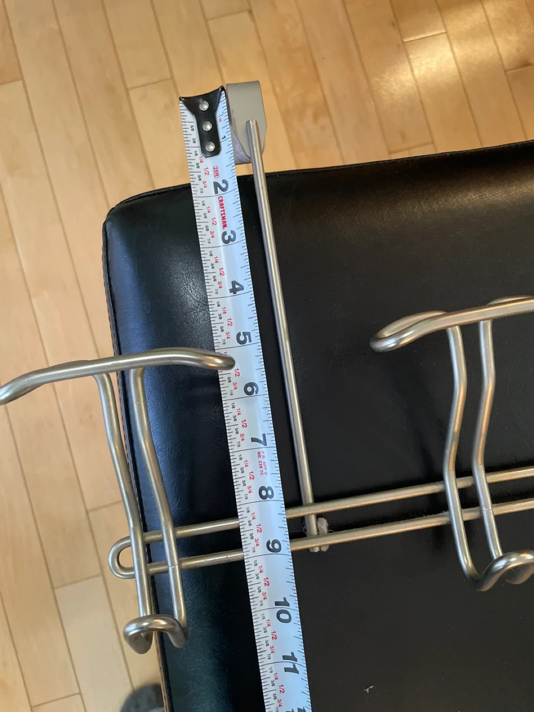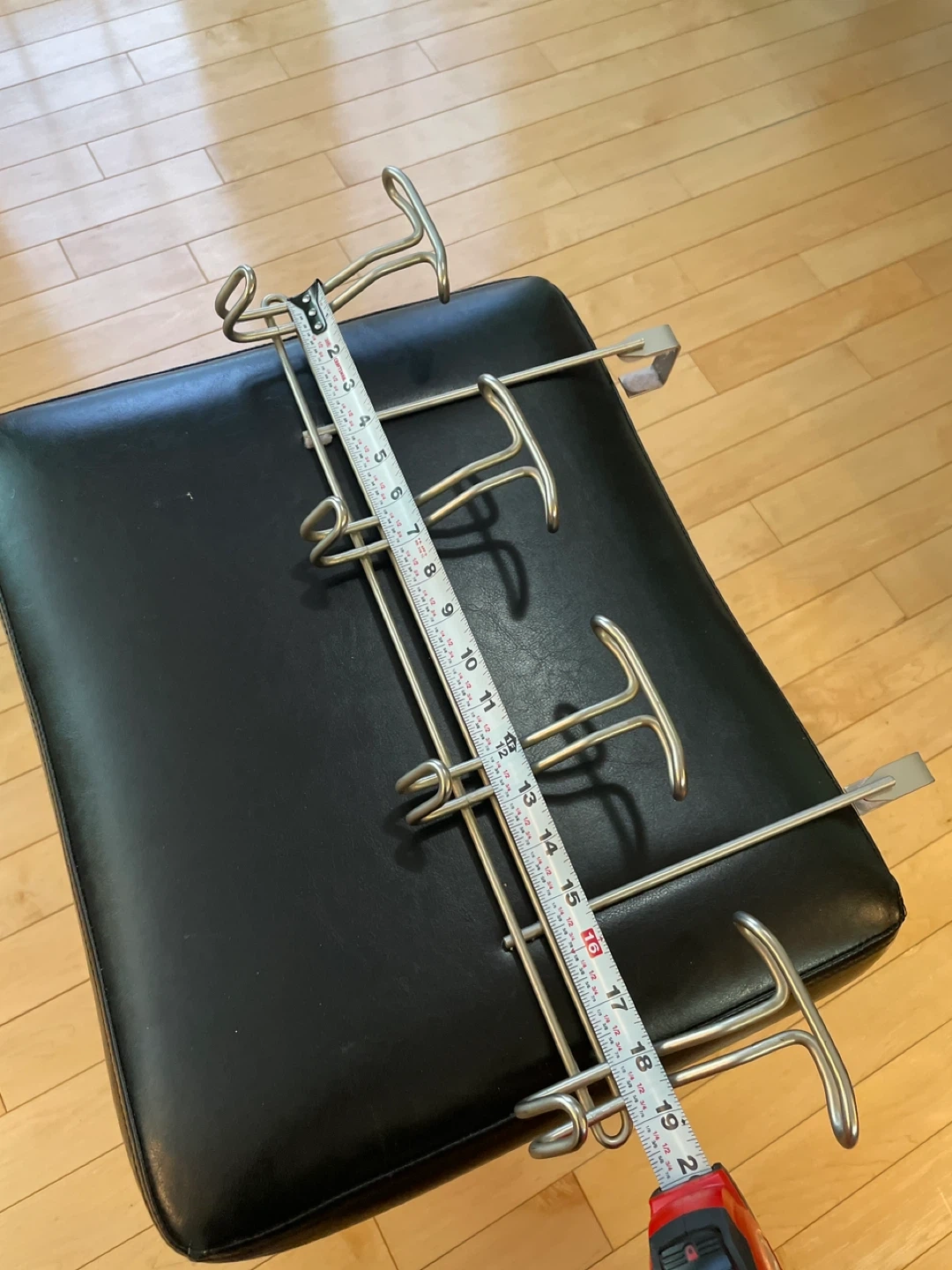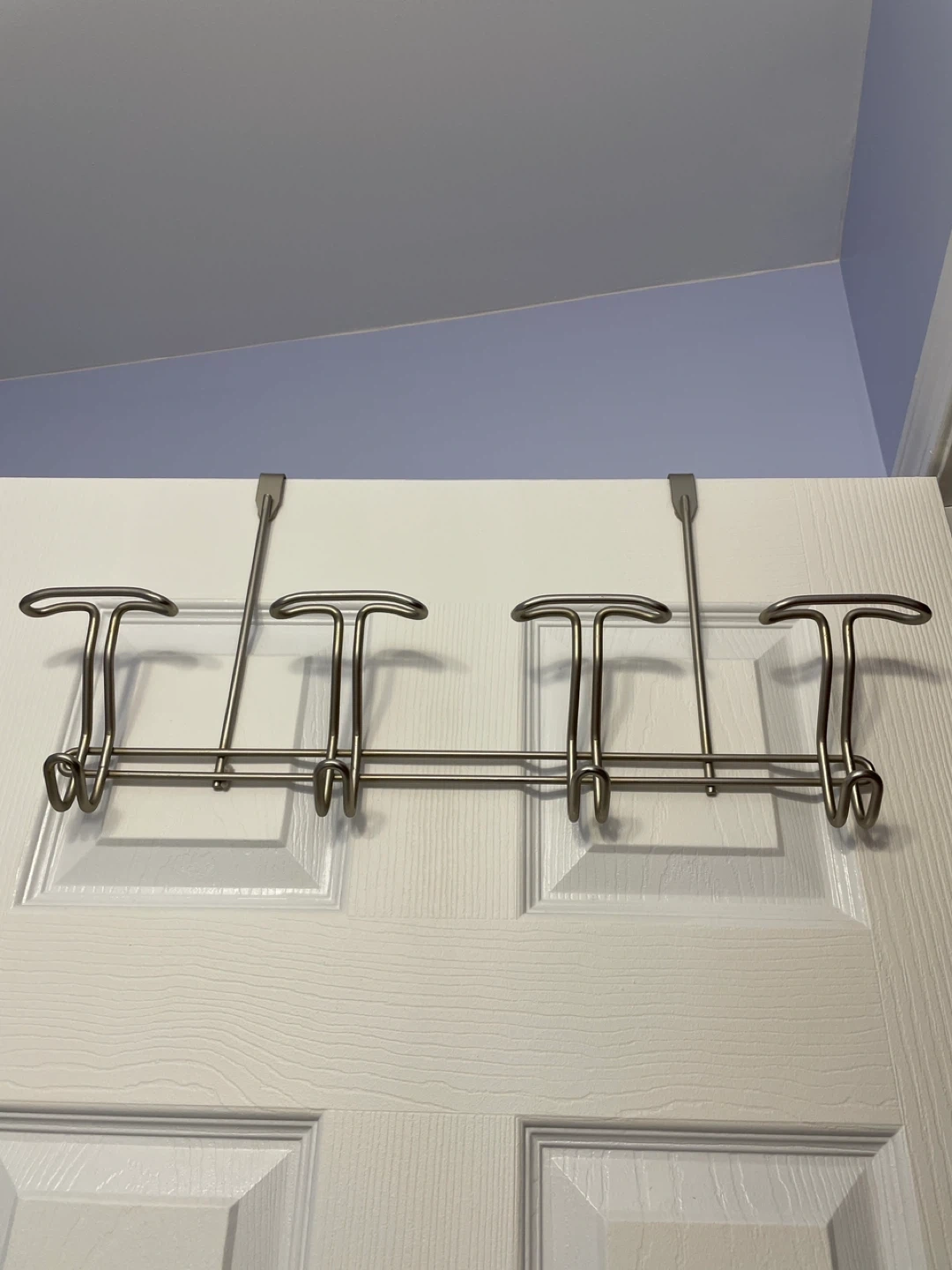 This over-the-door organizer rack features six hooks for hanging coats, bags, or towels. It's made of metal and is designed to fit over standard doors. Great for entryways or bedrooms needing extra storage!